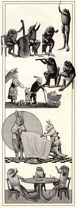 Novelty Taxidermy is the mounting of common specimens in amusing "human" poses. Rabbits, frogs, squirrels, and baby chicks make excellent subjects for this type of Taxidermy work. The specimens are preserved and mounted just like in regular Taxidermy . . . except that the imagination of the student can create hundreds of droll and amusing situations in which to pose his subjects. Backgrounds and miniature furniture can be created or adapted from children's toys.