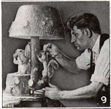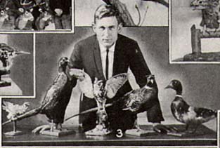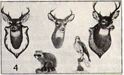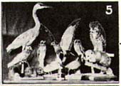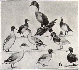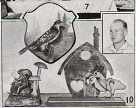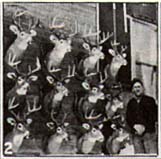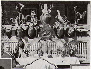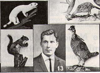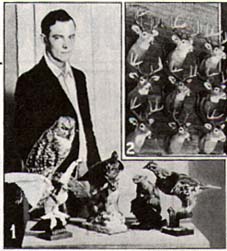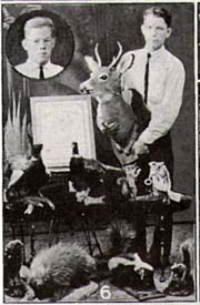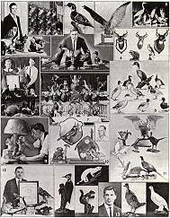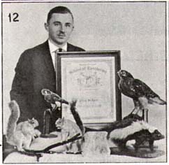 Picture No. 1 shows H. D. Desoletta from N.Y. with his interesting collection. Picture No. 2 is H. P. Warner of Wisconsin with 12 deer heads, representing a profit of many dollars. Picture No. 3 shows M. L. Morell from Illinois with his fine bird collection. Above him are a wood duck and an eage also mounted by him. No. 4 shows some fine work by Wm Feazer of Pennsylvania; and No. 5 an unusual collection of birds and animals mounted by Paul Bersche of Nebraska. Photo No. 6 shows two brothers -- Bartley and Thurman Mumma of Ohio who have become expert Taxidermists. Picture No. 7 shows C. L. Armstrong of West Virginia, with his large and varied collection. Photo No. 8 is a fine collection of water fowl mounted by B. F. Brannon of Alabama. No. 9 shows B. Cauny of Michigan at work on a squirrel lamp; and No. 10 W. J. Christensen of Utah with an interesting collection of novelty work. The specimens in No. 11 are the work of Wm. Mounty of Pennsylvania, and in the picture No. 12--Elmer G. Henry of California with his diploma and some of his excellent work. P. D. Hougaard of Canada mounted all the birds and animals grouped around his photograph. (No. 13) |