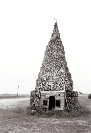 The Biggest Birdhouse in North Dakotaby Matt Bergstrom Out on the floodplain of the Red River of the North, the horizon receded to an absurd distance. Faraway lines of railroads, telephone lines and gravel roads twisted past and then behind us silently. I was riding with Pat Kelley south on Highway 18 in eastern North Dakota. Presently an elevator town would break into the drab monoculture of some of the flattest farmland in the U.S. From the days when the plains were known as the "Great American Desert", travelers are still appalled at the cultural desert that must be crossed to reach the promised land. The table-flat floodplain here made easy passage first for the Great Northern Railway, then Highway 10, and now Interstate 94, each a faster track across the repulsive landscape. But here were sugar beets, sunflowers, soybeans growing and spreading to the edges of rich earth. We came to an intersection near Casselton. What was that? Down the road to the right some kind of pyramid rose amid a few buildings and trees. Even from this distance it appeared ancient and enigmatic. Up close the tower seemed to be made of rusty old cans piled inside a chicken-wire cage built over a windmill tower. The landmark is known locally as the Can Pile. In the 1930s, when Highway 10 was the only major road across North Dakota, Max Taubert opened a gas station here. The station was an important stop for truckers to and from nearby Fargo. Taubert was a frugal man, and he saved all the empty oil cans from the station in a pile. He built a rack to catch every last drop from the oil cans. In time the pile grew, and so did Tauberts business. He offered free ice water in his four stool lunch counter. The Can Pile went two smaller incarnations before reaching the size it is now. On the flat, treeless plain the tower could be seen for miles, increasing the expectation of a stop at Tauberts station. The station was open twenty-four hours a day, seven days a week. Under the Can Pile, a small room was used as a gift shop and later a chicken coop. By the time of Tauberts death in 1973, the property contained twenty-six buildings. The history of the Can Pile was explained to us by George Loegering, the current owner of the tower. When we met him, he was just inside the large doors to his manufacturing plant. He was eager to tell us a few stories about the pile and Max Taubert. Although Taubert is gone and the pile has gotten no taller, Loegering mentioned, "the stories get bigger every year." "Ask any of the old-timers, theyll tell you lots of stories about him." Loegering then proceeded to tell us a couple humorous legends about the cantankerous old man, but somehow they seemed familiar, as if we had heard a similar story before. Taubert died a bachelor at an old age, leaving only a brother behind. When Loegering bought the property of Tauberts gas station, he tore down all the old buildings. The Can Pile was saved, but it was in the way of plans for the manufacturing plant. Loegering explained how he puzzled over how to move the tower. Finally it was decided to dig out around the base of the tower. Heavy steel plates were slid under the supporting dirt and welded together. A bulldozer chained to the sled tried to pull the Can Pile but it was too heavy. Two bulldozers together could not pull it. "We had 100,000 pounds of machinery pulling on that thing," Loegering exclaimed, but only when a third bulldozer pushed from behind would the tower budge. Soon after being moved to the other side of the building, on July 4th, 1978 a tornado descended on Casselton. Windows of the plant were torn out of the plant. Construction materials from a new home across the street were blown away. The Can Pile crumpled underneath and leaned back a few feet. Cans were scattered fields all around but somehow the pile survived mostly intact. Now in more peaceful days the cans shone dully in the sun. Loegering believed the cans in the center of the pile, protected from the weather, were shiny as if they were new. Even the rusty cans on the outside still had quaint oil labels. From the holes in the can tops we could see straw and sticks. "Some people call it the biggest bird house in North Dakota!" Loegering said. The old Can Pile no longer stands out as it did before. Trees planted in the 1940s have grown taller than the pile and hidden it from the Interstate. Aside from a child on a bike, there was little traffic on Highway 10. But the old truckers still remember the landmark. When Loegering explains to a customer where his business is, a number of times he or she will ask "Is that anywhere near the Can Pile?" photo by Pat Kelley |