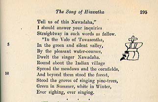 Long ago a young boy sat in an elementary school classroom on a fine Minneapolis spring day. He listened as his teacher read about the "Song of Hiawatha" and all the pupils followed along in their text books. And then she was asking them the questions at the end of the story, such as "Who was Nawadaha?" and "Why does Longfellow call the pine trees 'black and gloomy'? and "Where did the wigwam of Nokomis stand?"