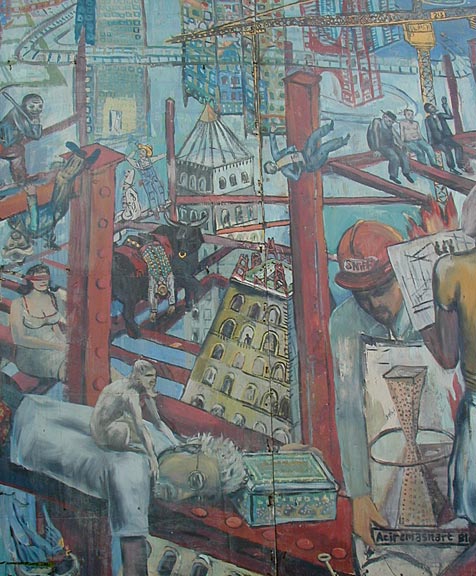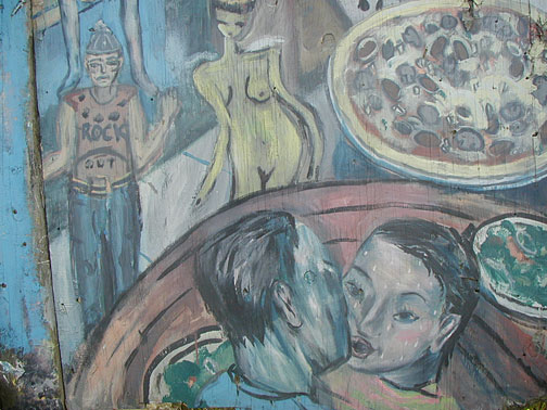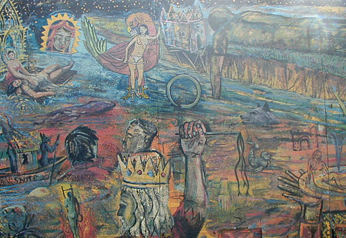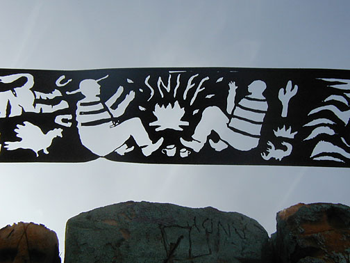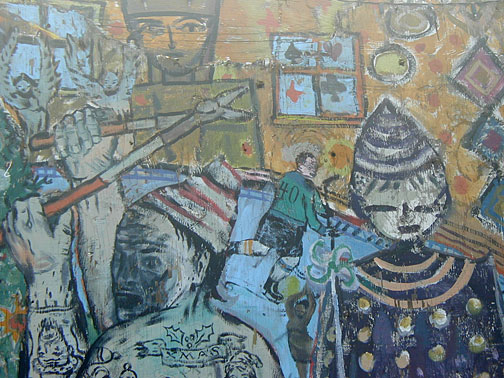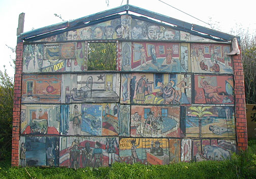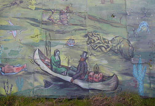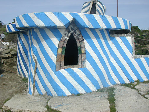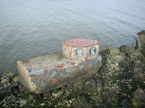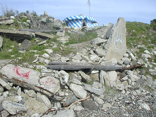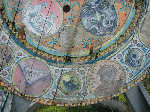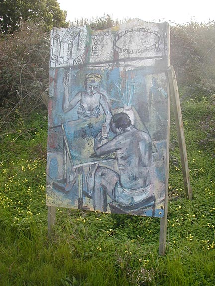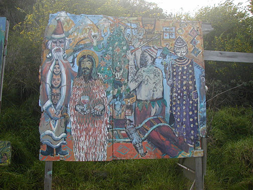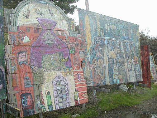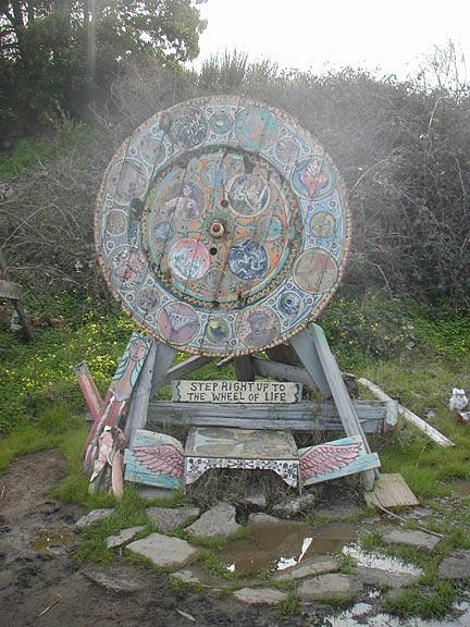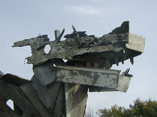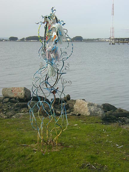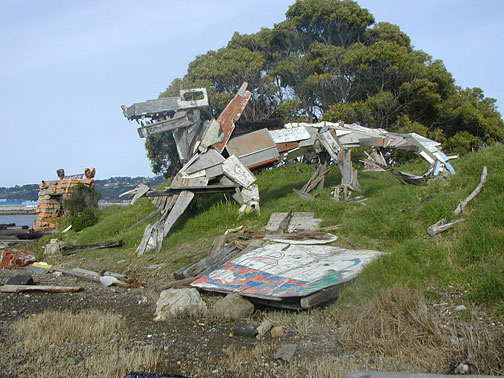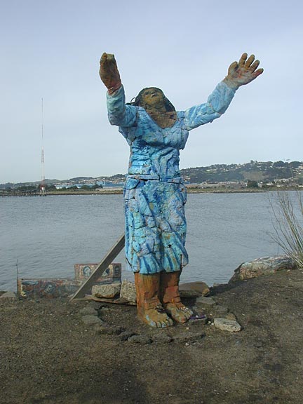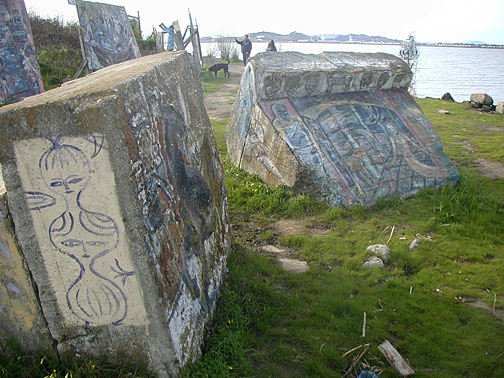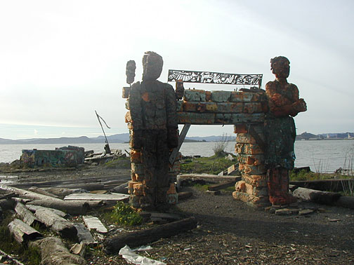 The city of Albany evicted the homeless who were camped at the Bulb in 1999, and the artworks seemed doomed. The site is in perennial danger of being cleared of its trash and developed into a clean park or nature area, depending on the whims of the city and state. Every year rumors of gentrification and the end of the sculpture park circulate. The unstable art deteriorates in the weather or is vandalized, but other artists create more work to replace it. The photos here were taken in 2004 and no doubt the site has changed much since then. Many of the homeless have returned to occupy the open land, and the park has become known as an off-leash dog park, where humans, animals, and art can run unpoliced and free of the big city's rules and strictures.