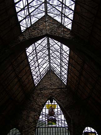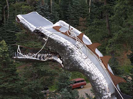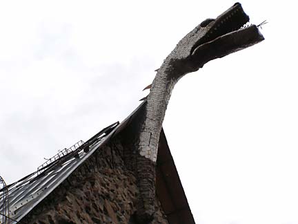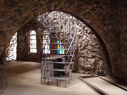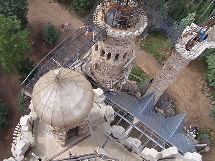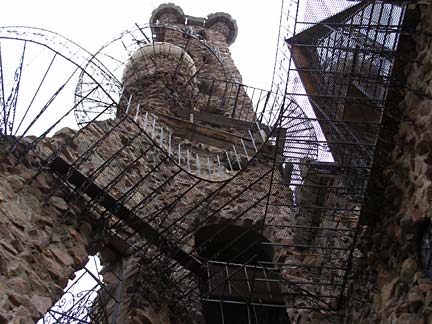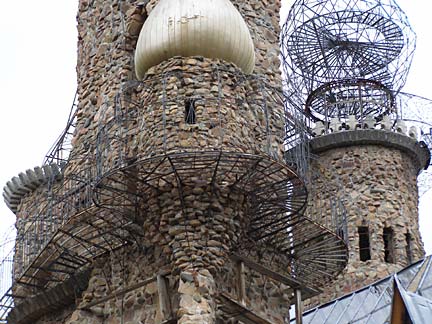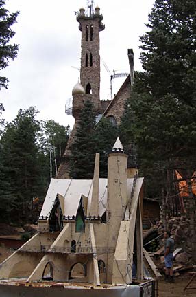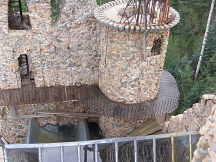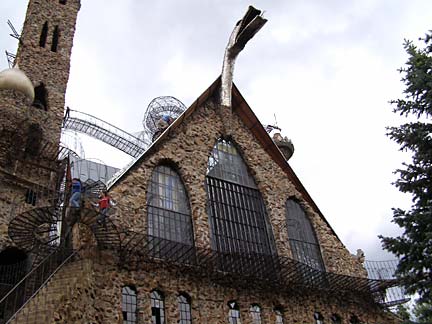 Jim Bishop first built a stone cabin on his property in the Rocky Mountin foothills west of Pueblo, Colorado in 1969. Neighbors said the rough stone construction looked like a castle, which inspired Bishop to keep building, resulting in a spectacular fantasy fortress of crooked towers and baroque wrought ironwork. Using leftover rock from highway construction projects and working primarily alone, his castle has steadily taller year by year. The castle features several towers, the highest soaring to 160 feet. The rough walls are strung with spindly wrought-iron balconies and staircases like a fun-house maze to the top. Climbing the castle is not for those afraid of heights. A fire-breathing dragon figure-head made from recycled metal cafeteria trays tops the great hall of the castle, which is rented out for weddings and special events.