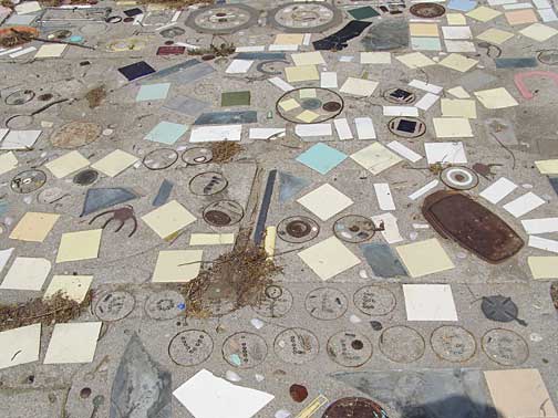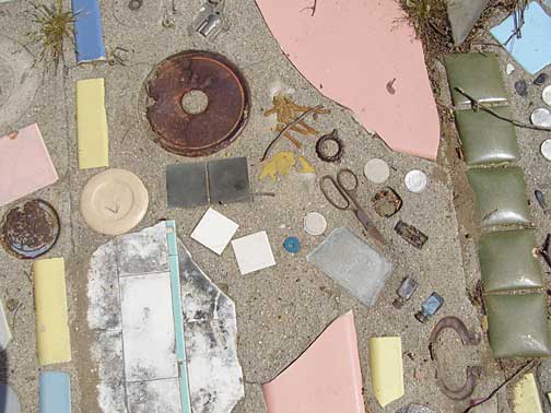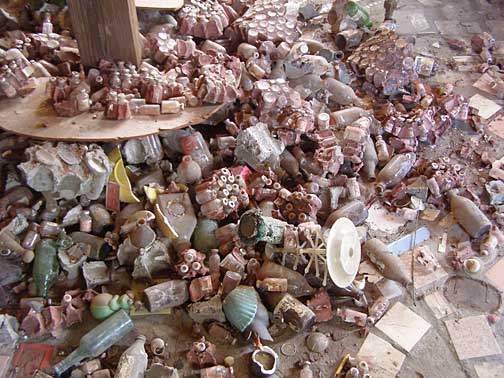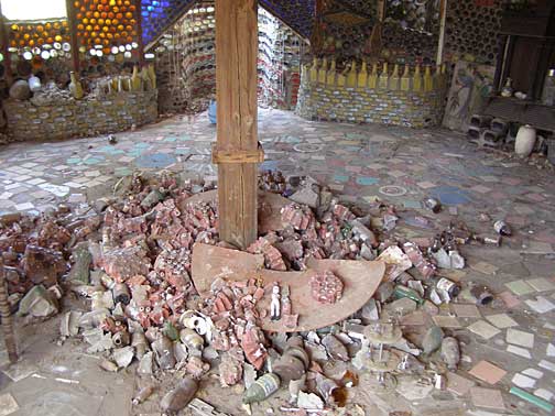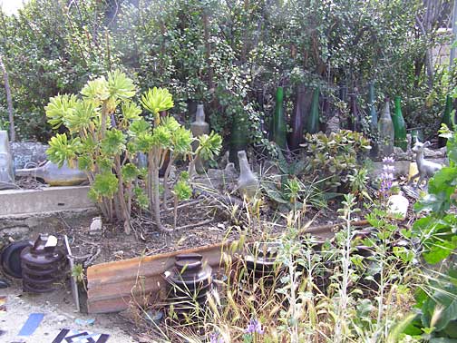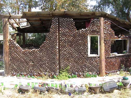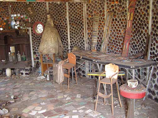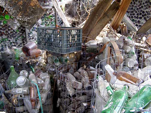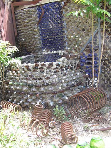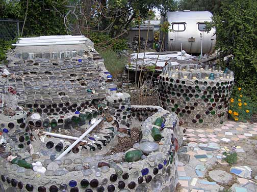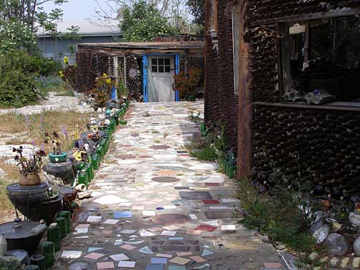 When she started her bricolage village the property was a dusty country lot next to a turkey farm. But nowadays Simi Valley is a clean community of townhomes and suburbia better known for its Ronald Reagan Presidential Library than a garden made from trash. After the 1994 Northridge earthquake heavily damaged the Bottle Village, caretakers of the site secured FEMA funds to restore the structures. But local Congressman Elton Gallegly introduced a bill to specifically prohibit federal funds from being used to repair the Bottle Village, and the funding was withdrawn. Since that time friends of the Village have worked hard to stabilize the structures and keep the site open to visitors by appointment.
