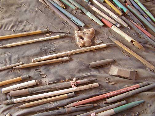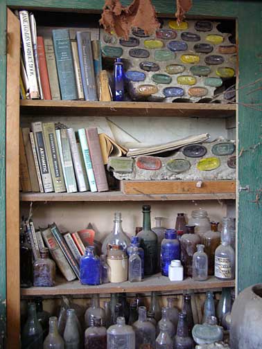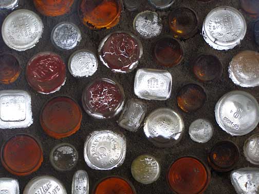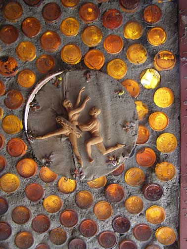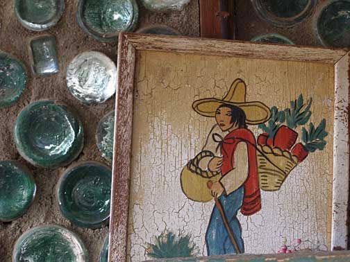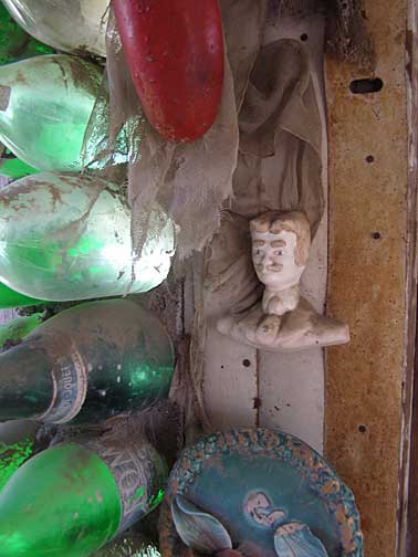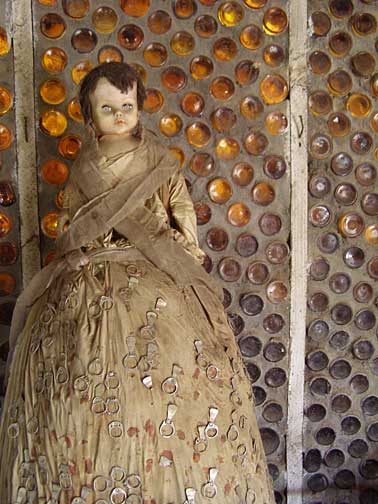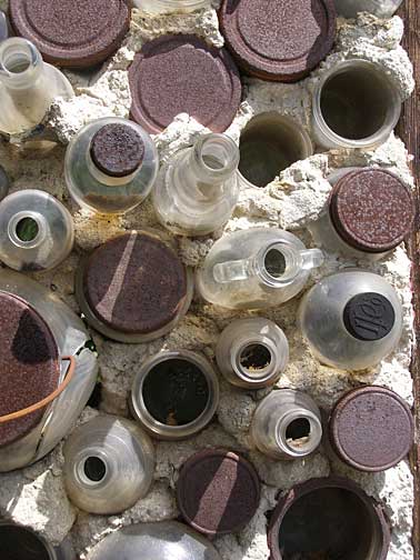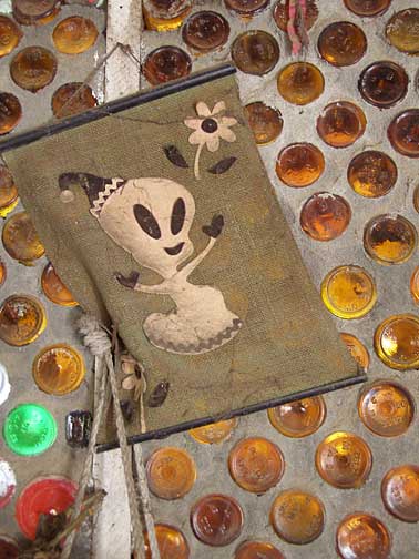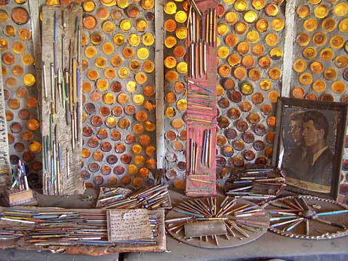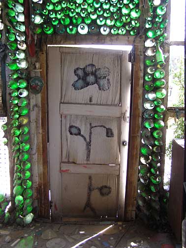Tressa "Grandma" Prisbrey didn't start building Bottle Village until she was 60 years old. Her first bottle house was inspired after seeing the bottle house at Knott's Berry Farm (a folly inspired by the original Rhyolite bottle house). It was simply a structure to house the enormous collection of pencils she'd been gathering for years. But from that beginning in 1956, the little garden and bottle-walled shacks on her property gradually became a small scale tourist attraction where Mrs. Prisbrey would show visitors the 17,000 pencils and many rescued dolls in her collection, and mosaics, houses and little towers made from glass bottles, television tubes and other colorful refuse scavenged at the local dump.