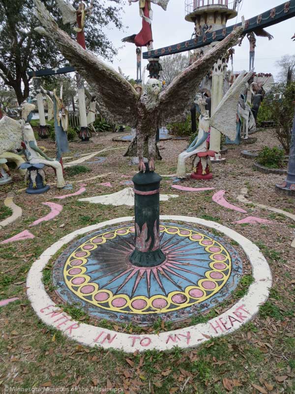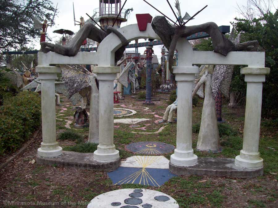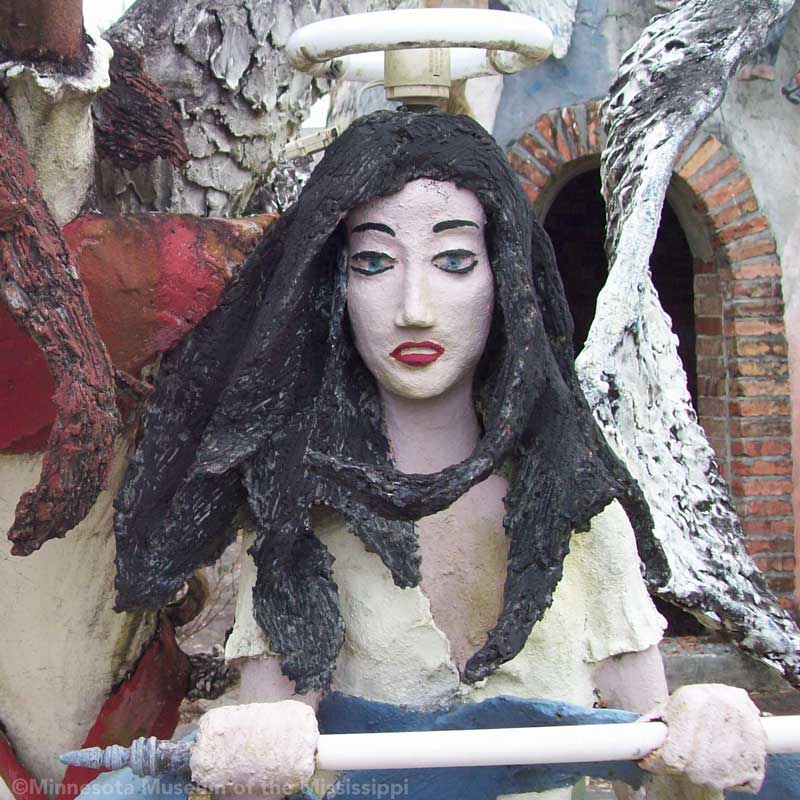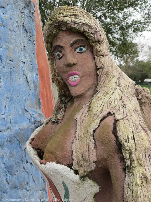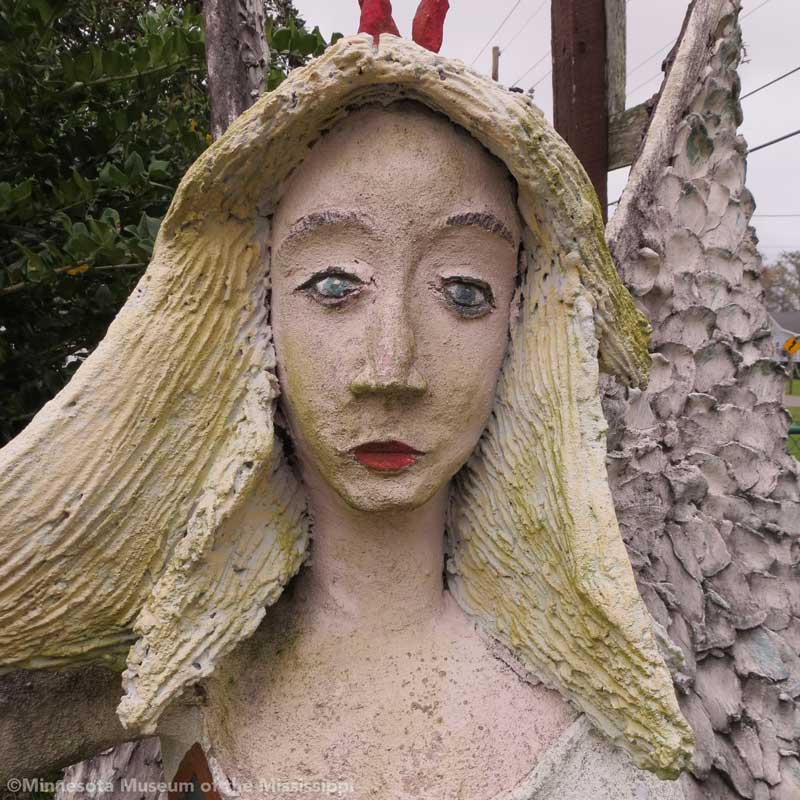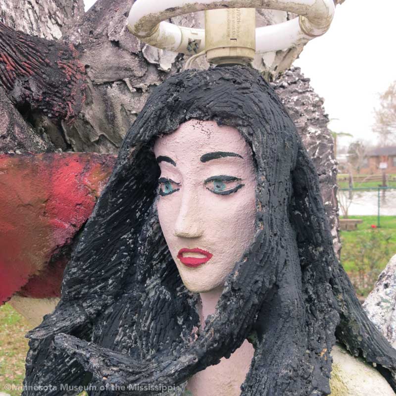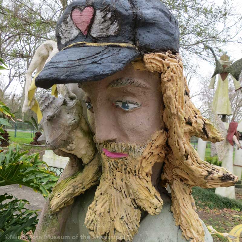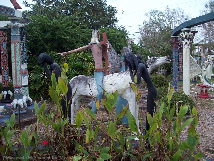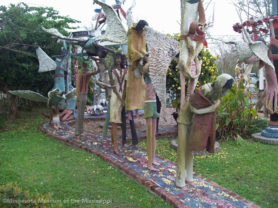 While working on the garden, the artist shunned publicity and forbid photographs. He answered questions about the meaning of the artwork vaguely, stating only that its purpose was to inspire young people. In 2000, after a decade of working on the site, Hill seems to have changed his mind about the religious message of the garden. He stopped paying rent, knocked off the head of the statue of Jesus and left town without a trace. In 2002 the site was donated to Nicholls State University and restored in partnership with the Kohler Foundation. Some statues were damaged or toppled by 150-mile-per-hour winds of Hurricane Ida in 2021 but the majority withstood the storm, a testament to Hill's skillful construction.