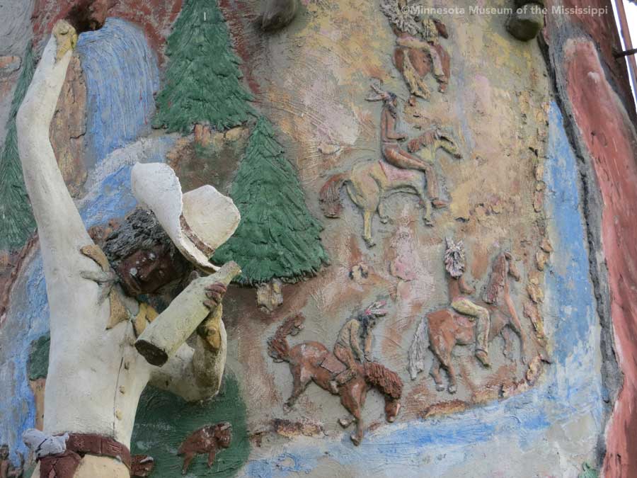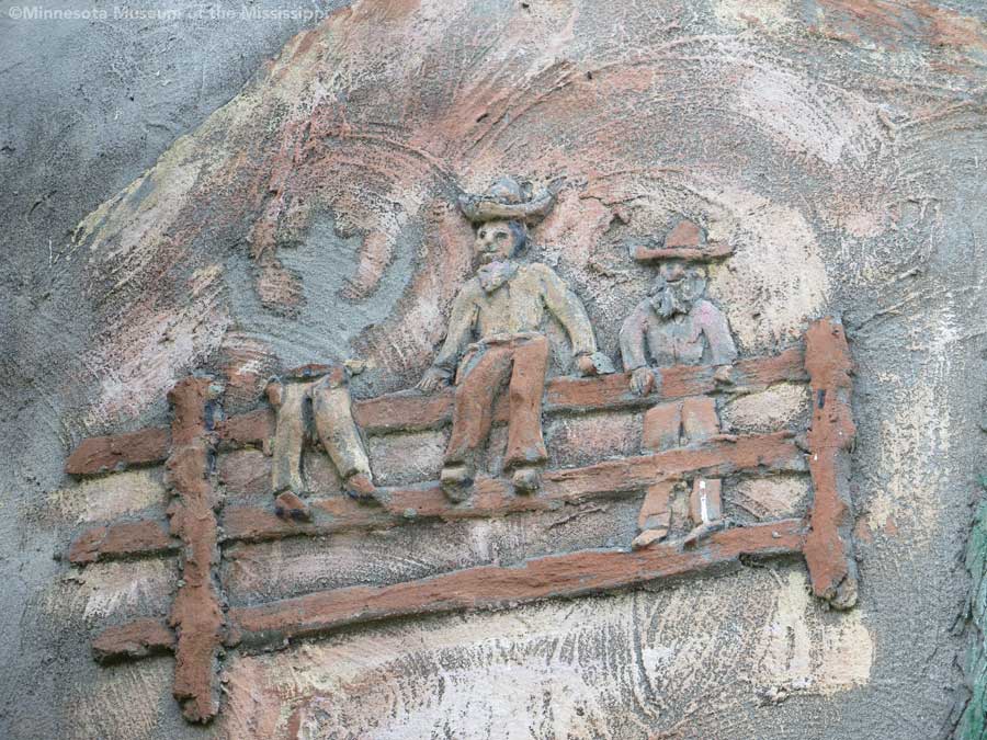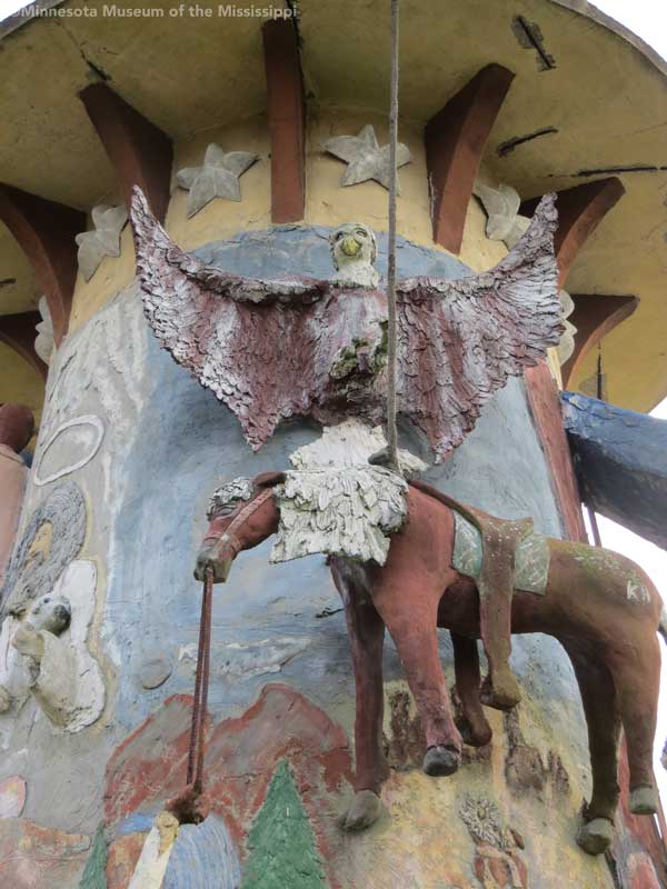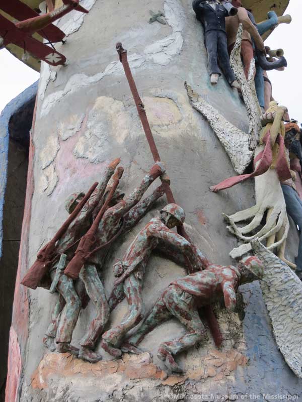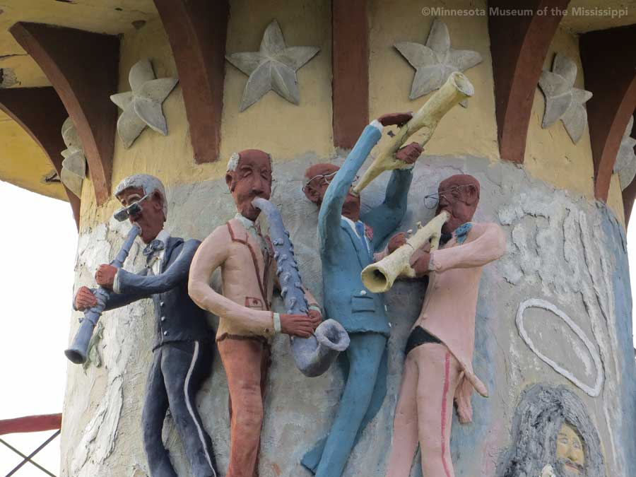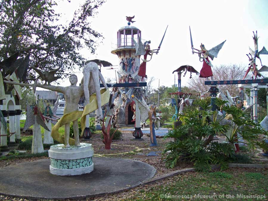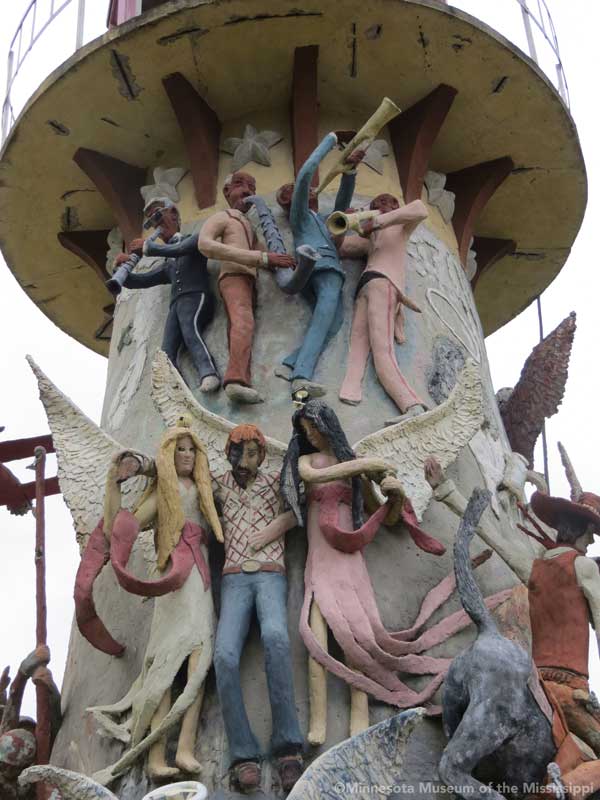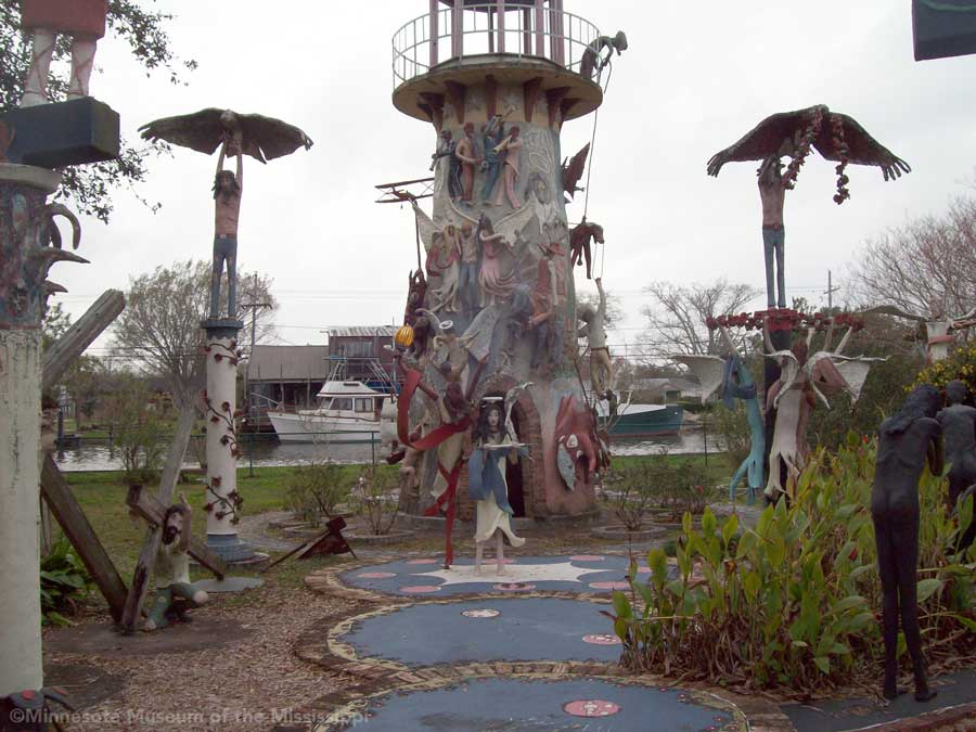 Kenny Hill came to the small Cajun town of Chavin around 1988 and made his living as a bricklayer. There he rented a strip of land along a bayou crowded with shrimp boats. After putting up a small house he began building a 45-foot tall brick lighthouse, then covered it with sculptures made from concrete over wire armatures and bas reliefs. Cowboys and jazz musicians, Native Americans and soldiers parade around the tower in a tableau of American history. At the center, a man seems to struggle with and be supported by angels.