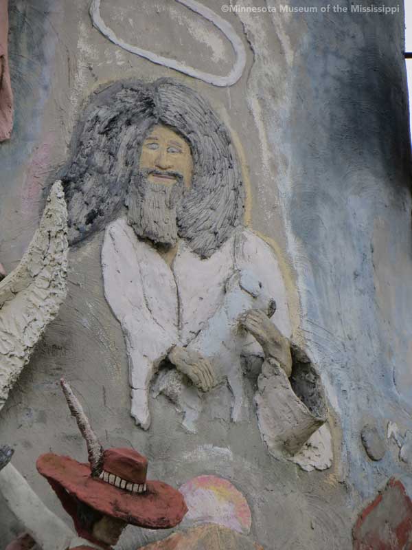 Arrayed in a semicircle to the left and right of the lighthouse are other Biblical scenes of angels and humans. Some angels fly weightlessly high above, defying their heavy concrete construction. Others seem to want to warn visitors which way to avoid or follow on a spiritual journey through the garden. Many incorporate round flourescent lights as halos, which must have been magical to see in the twighlight. The journey through the garden seems to tell the story of the artist's life. Numerous self-portraits show Hill in a baseball cap, with a bleeding heart, carrying a cross or lifted up by angels.