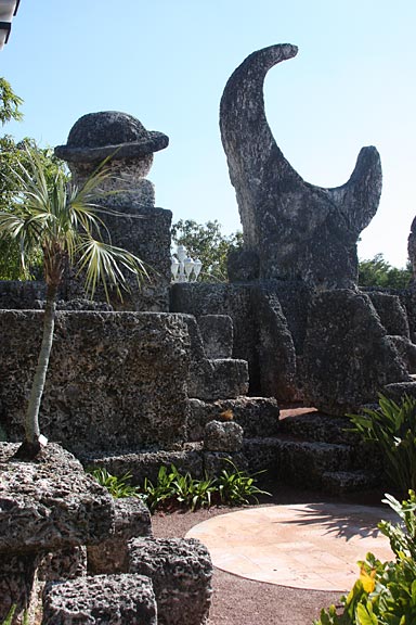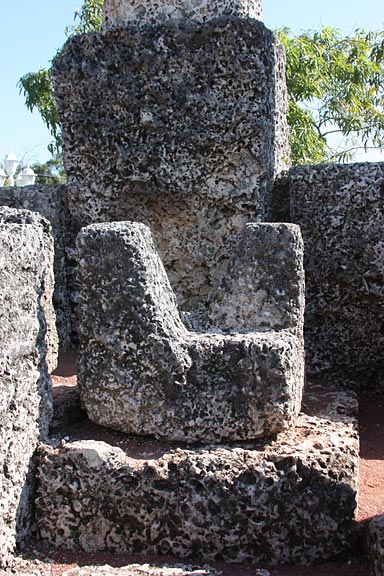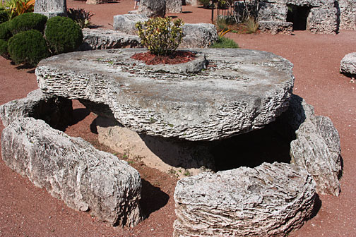 Leedskalnin taught himself how to chip and carve the brittle stone into shapes. With much patience, he carved chunky stone chairs and tables. He called his creation "Rock Gate Park". As his skills improved he sculpted even more ambitious monuments: chairs that could rock, monoliths 25 feet tall, tables in distinctive shapes, blocky thrones, stairsteps, sundials, fountains and tall crescent moons and a Saturn-like planet high on a pedestal.