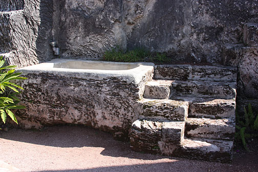 The stone walls of the garden are fitted together precisely without mortar. In the center of the garden, Leedskalnin dug a spiral staircase down to the water table for a well, and rigged up a bucket to lift water to a homemade "bathtub" lined with concrete. He carved stone chairs and beds for his imaginary family of husband, wife and child. In the corner he built a stone barbecue grill, with a homemade pressure cooker made from an auto transmission which could be lowered into the coals to cook a dozen hot dogs at once. He liked to cook them for the children who visited the garden, but its likely Leedskalnin subsisted on a bachelor's diet of hot dogs himself. Ed enjoyed taking visitors on guided tours of the garden, showing off his creations with a rehearsed script and pantomimed actions to demonstrate his innovative outdoor furniture and accessories of the castle.
