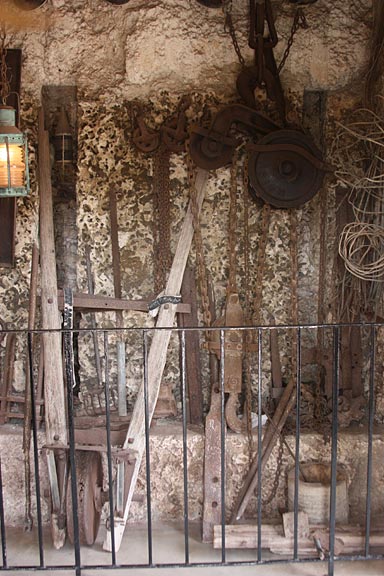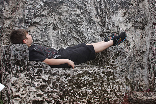 Its unclear what exactly inspired him to start quarrying the rock beneath his land. Southern Florida is underlain with thick beds of porous oolitic limestone which the locals call "coral". In this area the rock is covered by just a few inches of soil, so it was not difficult for Leedskalnin to scrape it away and begin excavating the bedrock. Using homemade tools crafted from auto parts scavenged at the dump, he chipped out squares of rock. He wedged chisels made from Model T leaf springs horizontally under the rock slabs until the brittle rock suddenly cracked along the weak points he'd created. With a block and tackle pulley system, he'd slowly lift one end of the slab, prop it up with stacks of wood, then repeat with the other end, gradually lifting and moving enormous stones all by himself.
