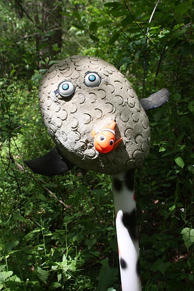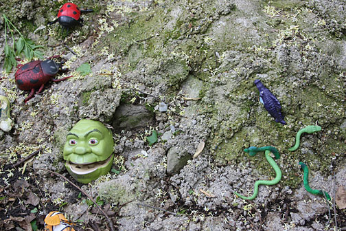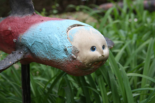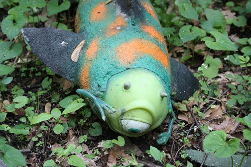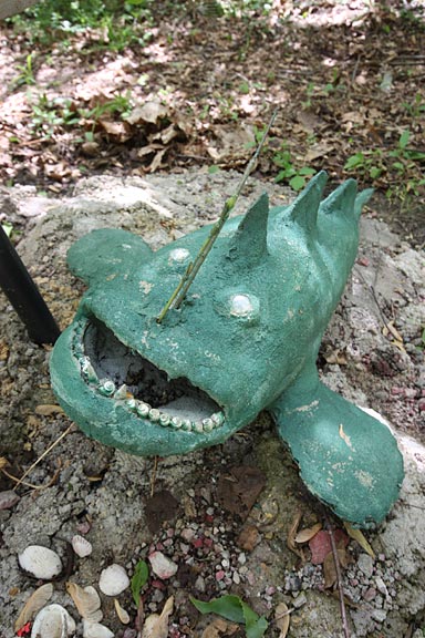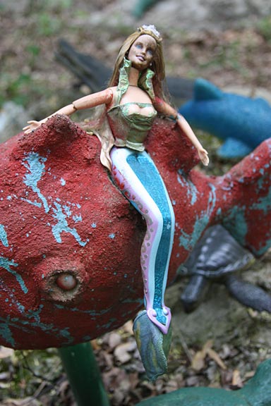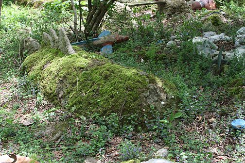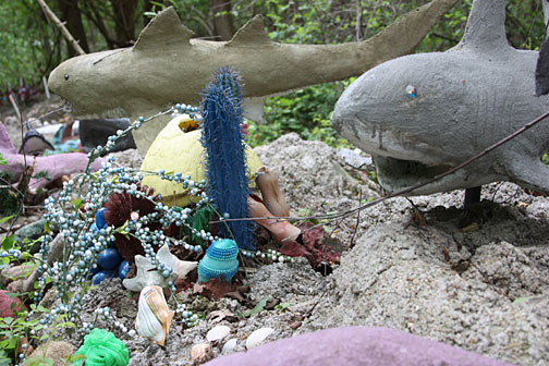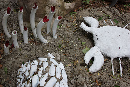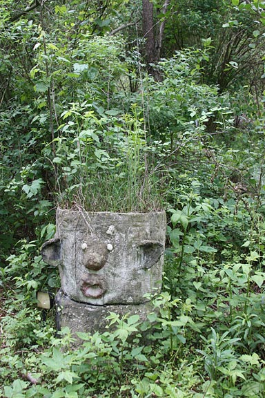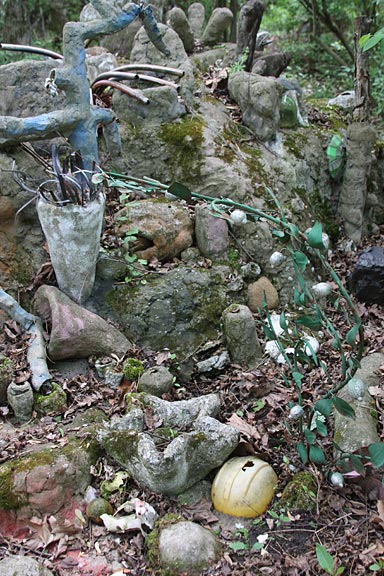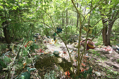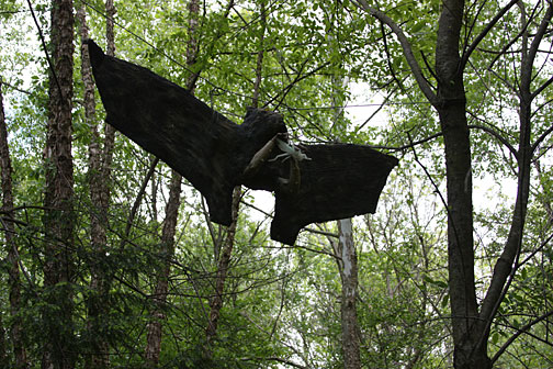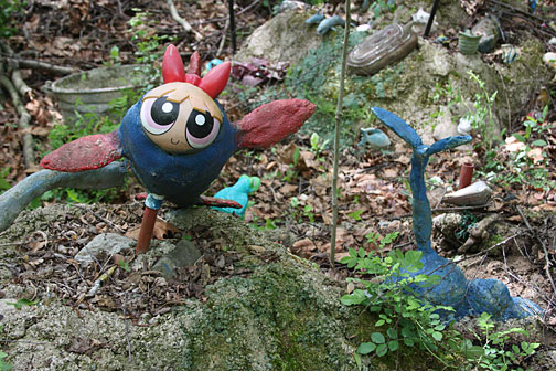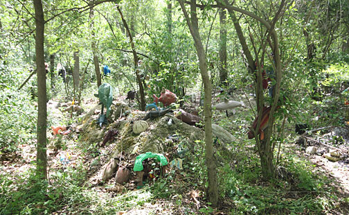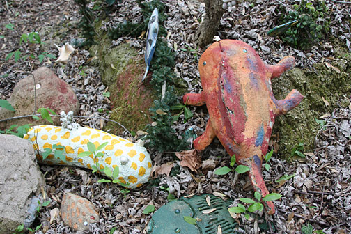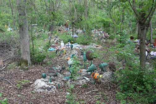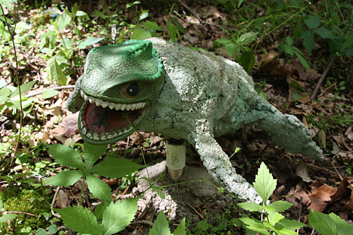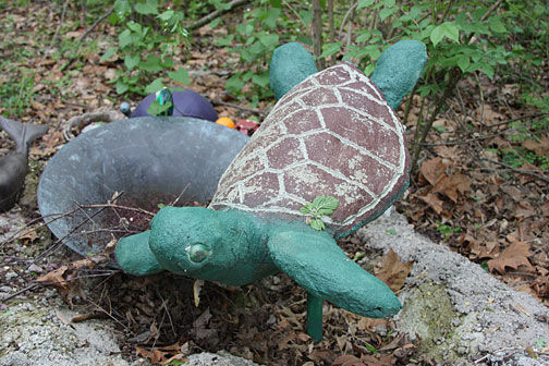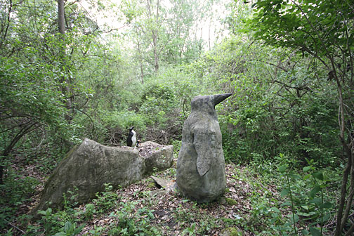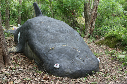 Narrow tracks lead us through the dense jungle of ferns and mosquitoes among the reefs of small creatures to an area of larger creations. Largest of all is a huge whale sculpture built over the body of an old car entirely encased in concrete. Past here the trail wanders back to the main road, but in other clumps of creatures are barely visible beyond in the forest, such as a small scale Lost World of toy dinosaurs embedded in cement atop a stump like a mini volcano. Other trails lead off to a clearing around a six-foot penguin like some unexplained idol of the arctic lost in the midwestern woods.