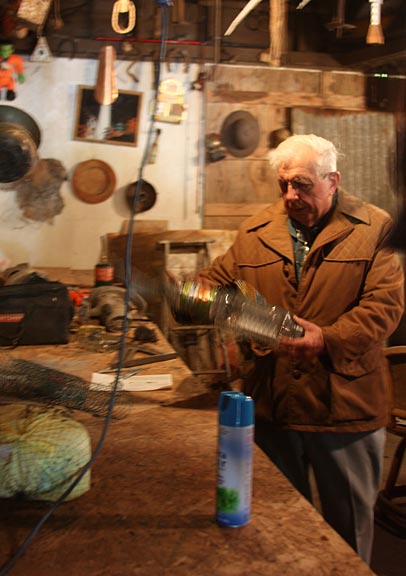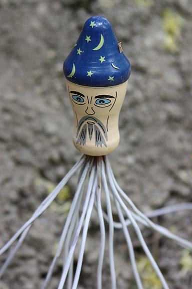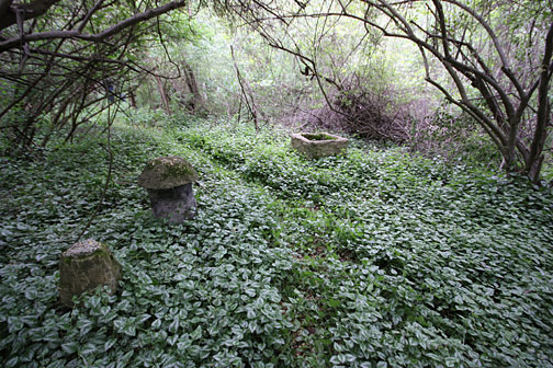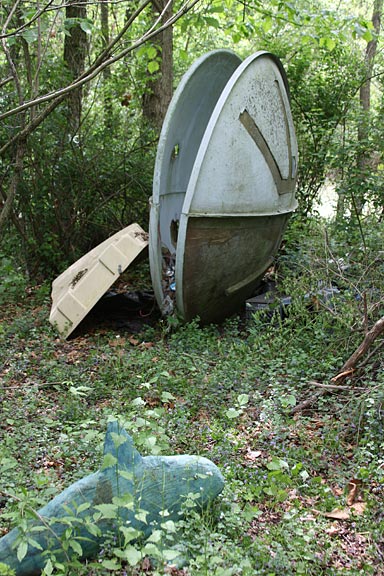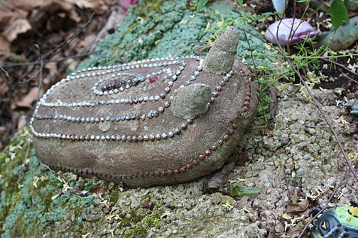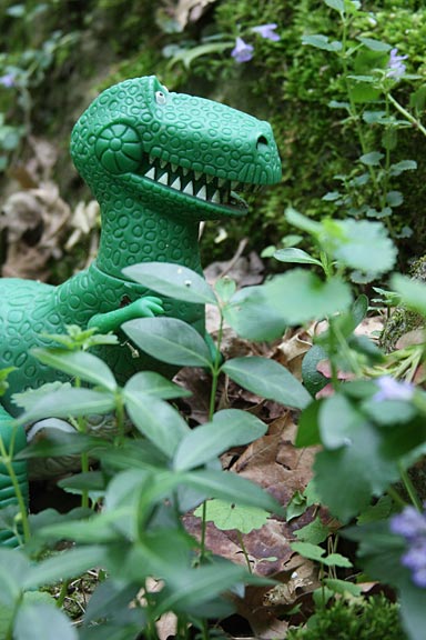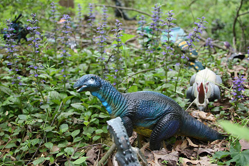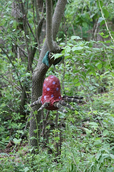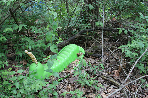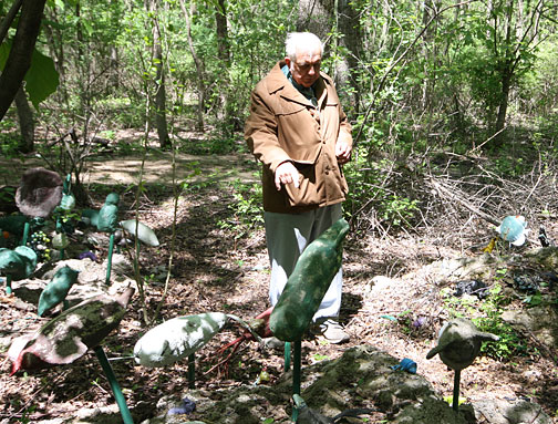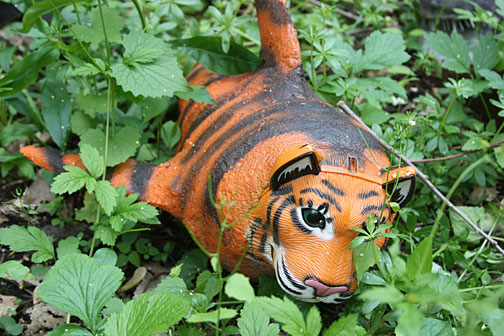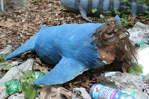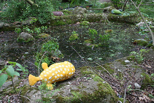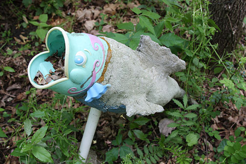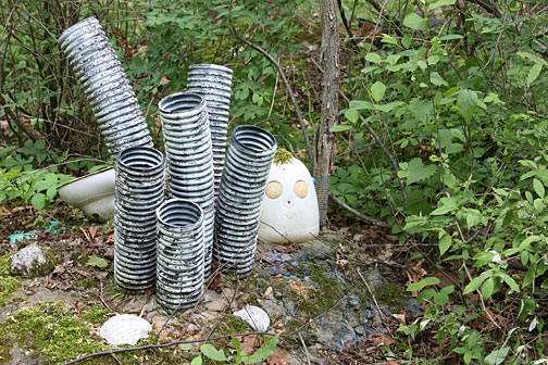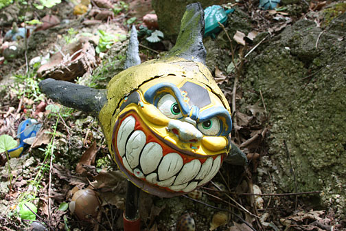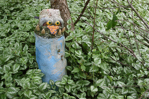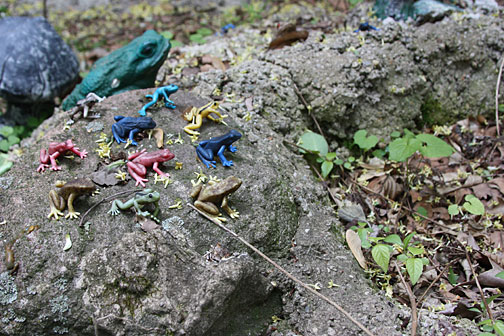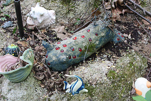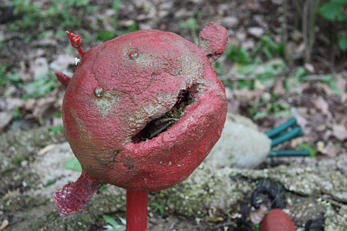 Narrow tracks lead us through the dense jungle of ferns and mosquitoes among the reefs of small creatures to an area of larger creations. Largest of all is a huge whale sculpture built over the body of an old car entirely encased in concrete. Past here the trail wanders back to the main road, but in other clumps of creatures are barely visible beyond in the forest, such as a small scale Lost World of toy dinosaurs embedded in cement atop a stump like a mini volcano. Other trails lead off to a clearing around a six-foot penguin like some unexplained idol of the arctic lost in the midwestern woods.