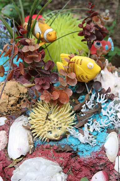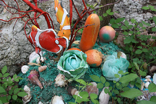In about 2001, Neswick started working on an outdoor sculpture garden called "The Coral Reef" sited on several acres of forest bottomland along the Kankakee River on the grounds of a hunting club. Scattered in the dense woodland are seventy-six "islands" or groups of small concrete tableaus depicting sea creatures, fishes, reptiles and mythological creatures. Some of the sculptures are modeled on real animals, such as a painted clownfish and a sea anemone made from a mop, while others are wildly fantastical creatures incorporating plastic toys as heads or arms and legs into sculpted concrete bodies. Hybrid pop culture creatures with Disney faces and weathered bodies provide a colorful peekaboo sense of humor in the Coral Reef. Rubber fish hang from the trees as if swimming above the ocean floor.