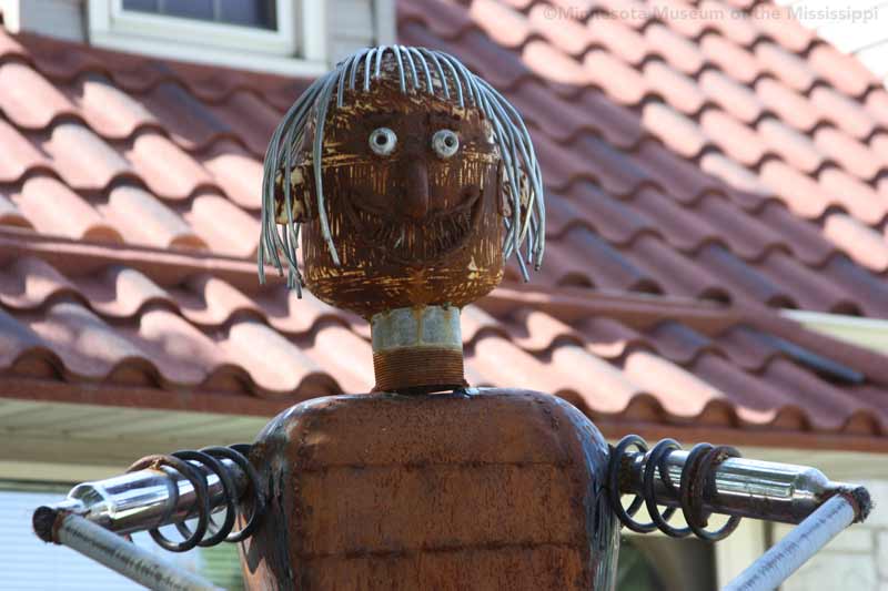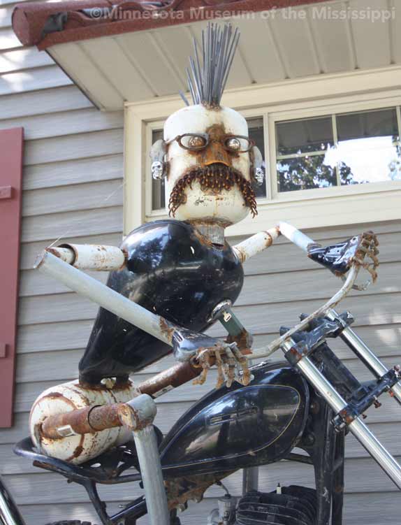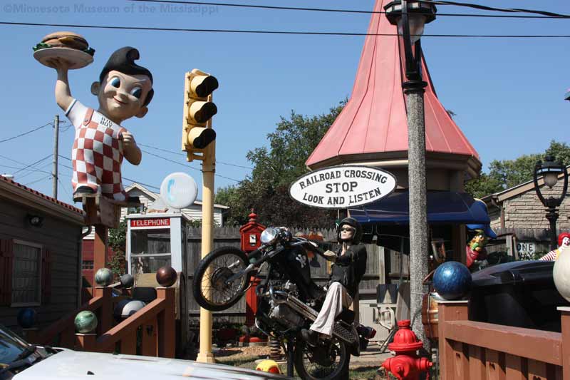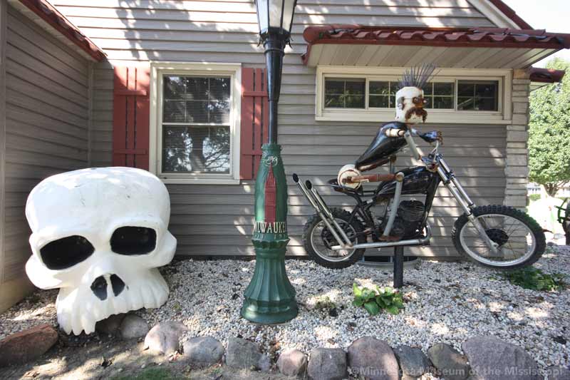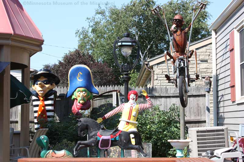 In the years since, he has added more to the yard. Welded metal sculptures ride old motorcycles. Fiberglass mascots from fast food restaurants add a bit of pop-culture whimsy in contrast to the antique telephone boxes and lamp posts. Though some of the antique items represent local Milwaukee history, like a police call box in the backyard, the yard is less of a museum of artifacts than a playful combination of surprising objects. Though the yard is crowded, it is not cluttered. Serocki repaints the Cadillac often so that it looks colorful and intentional, not a rusty wreck abandoned in the yard. The art seems aimed at surprising passersby or sparking a conversation among neighbors more than creating a garden space useable by the residents. While the yard stands out on the block dramatically, the 1940s-era house hidden behind looks much like its neighbors.