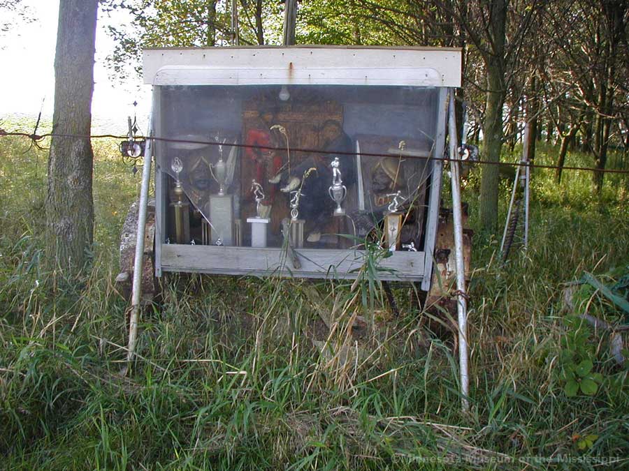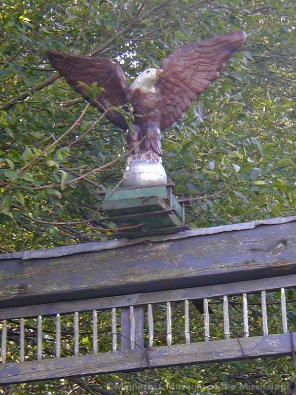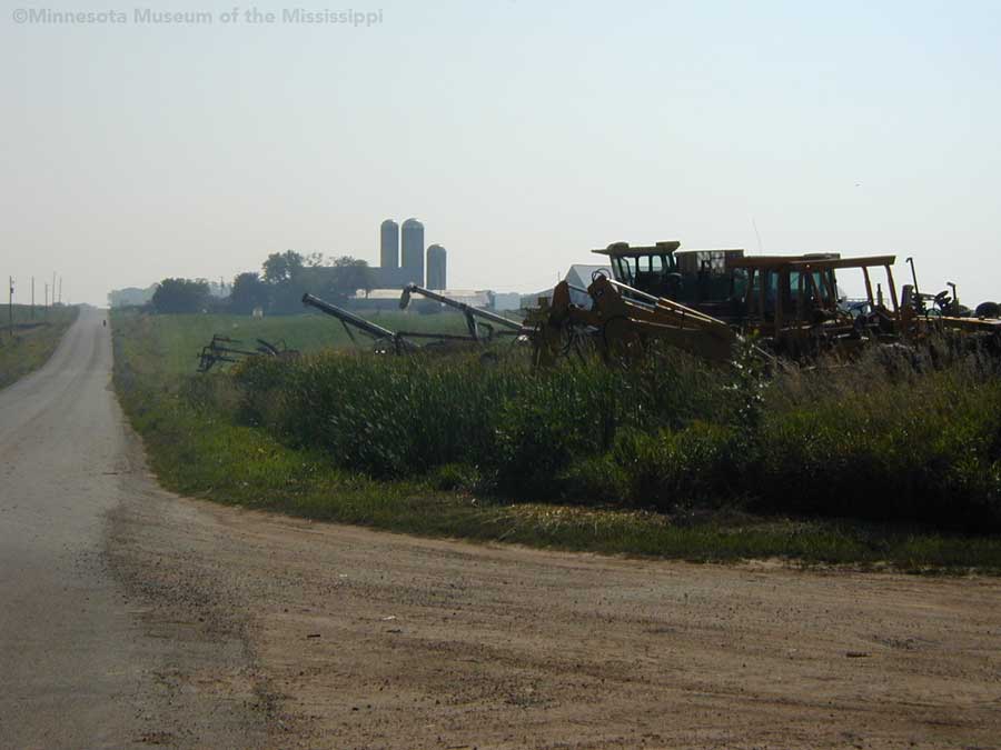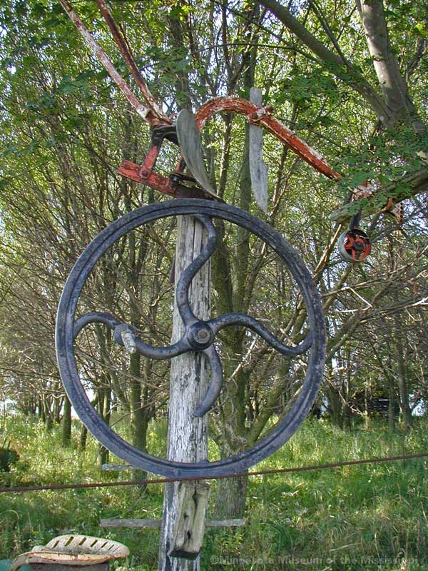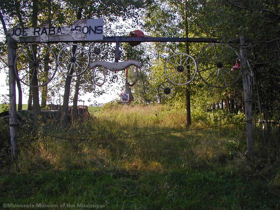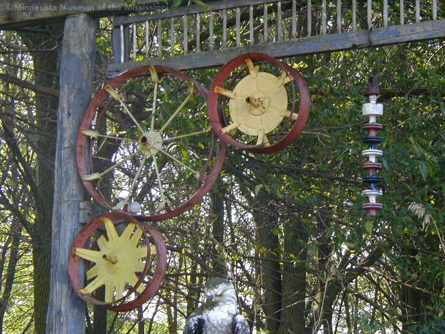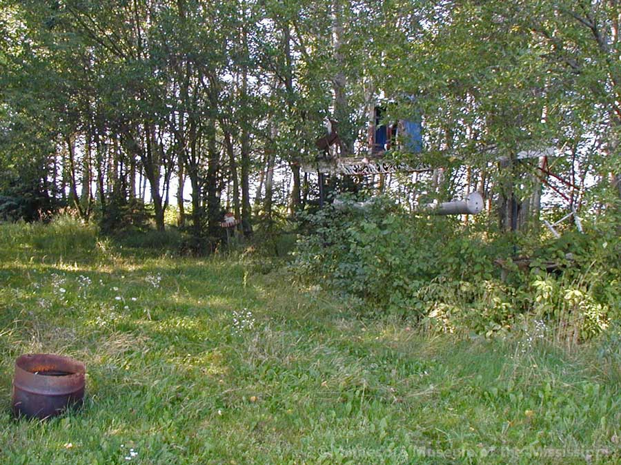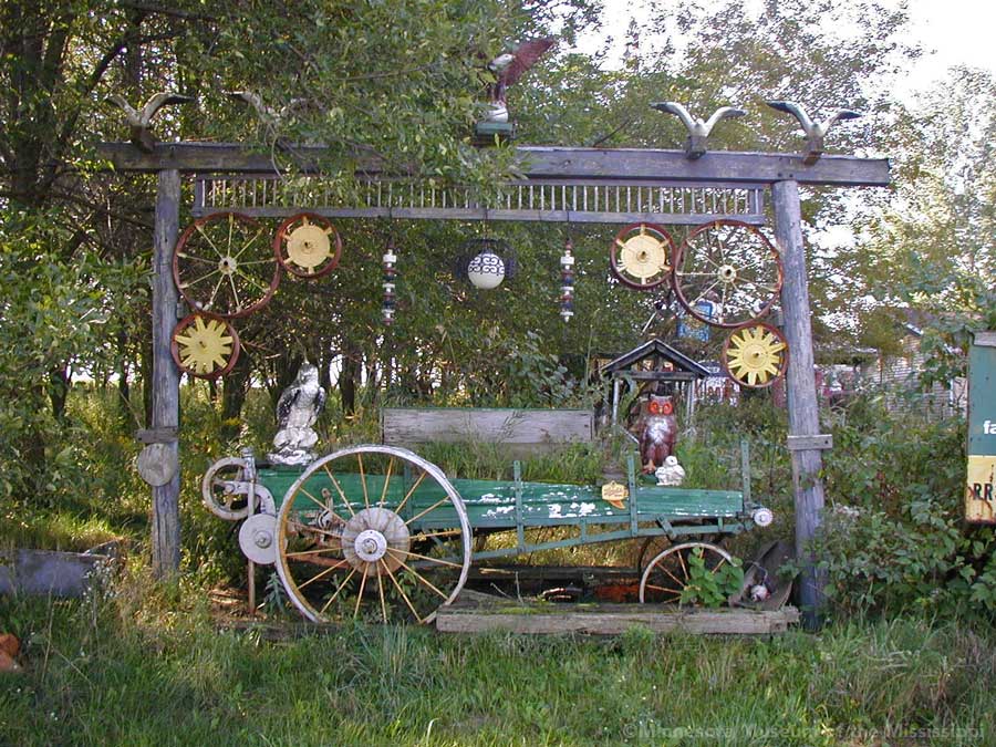 While biking on a country road in 2004 I came across this roadside garden in a little forest surrounded by open farm fields. In the wind-break grove of trees beside a farm house stood a number of decorative signs or gateways made from wood, tractor wheels and bric-a-brac. Farther back in the weeds I could see a teepee beyond a collection of rusty tractors and gas station signs, not much different from other country junkyards of antique farm implements. The colorful homemade signs gave the yard a bit more of a public display feel than just a private collection, though whether the builder meant for visitors to enter the grove or just enjoy the artwork from the roadside was unclear. The garden was in a dilapidated state, overgrown, unpainted and deteriorated. Perhaps it was more welcoming when it was first built.