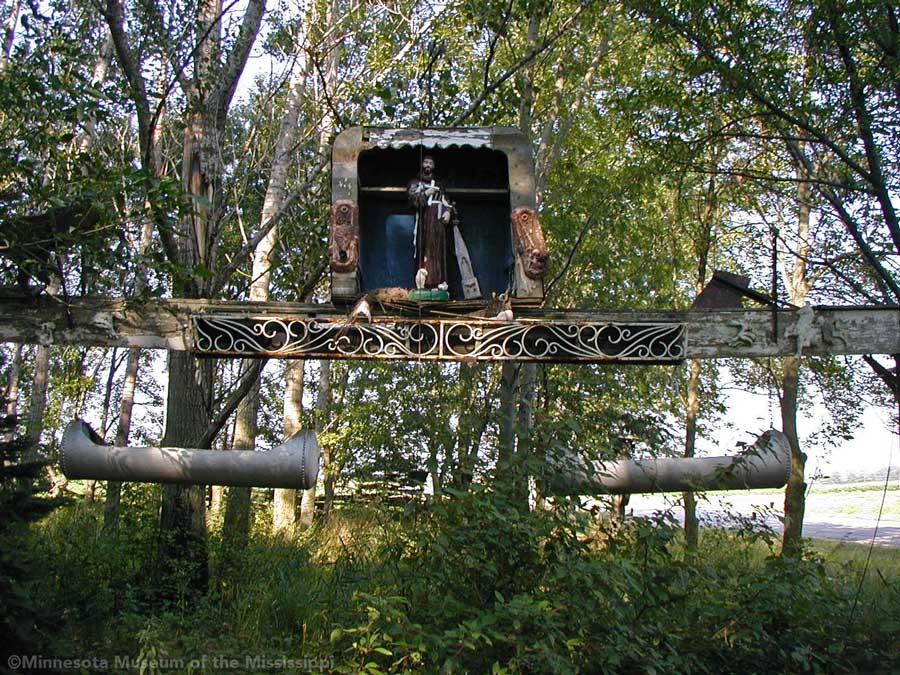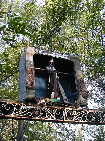 On the other side of the house in another little wind-break forest there was another elevated sign-like structure. A long crossbeam decorated with filigree supported a shrine with a statue of St. Francis, with hanging planters below made from old water tanks. Indeed the little grove was alive with chirping birds taking refuge from the bleak farm fields all around, a vibrant oasis of life gathered around this place. It was a tranquil spot to rest for a little while before getting on the bike again.