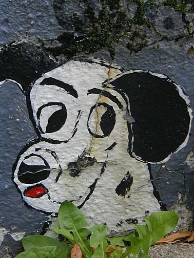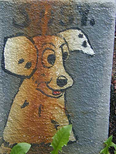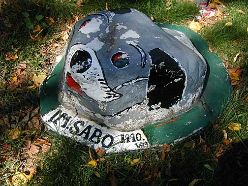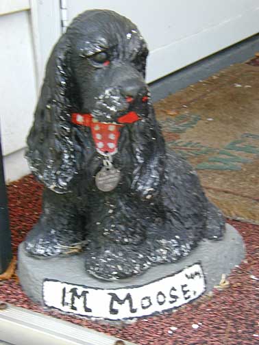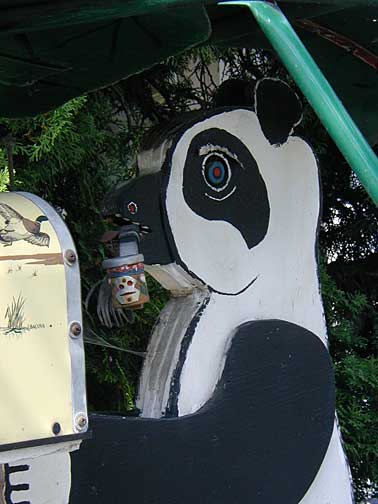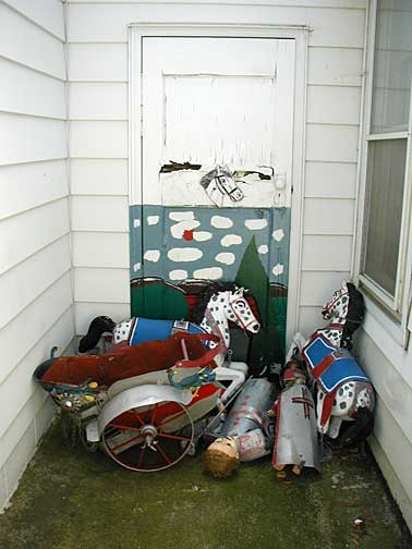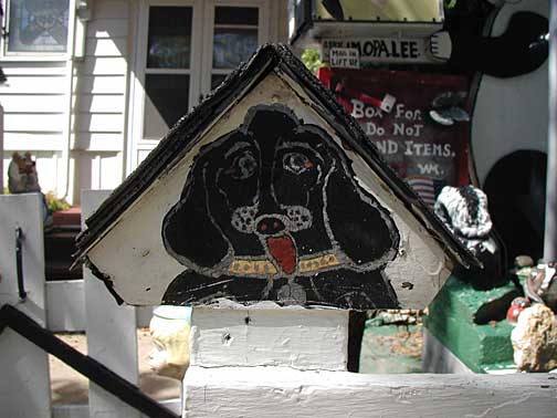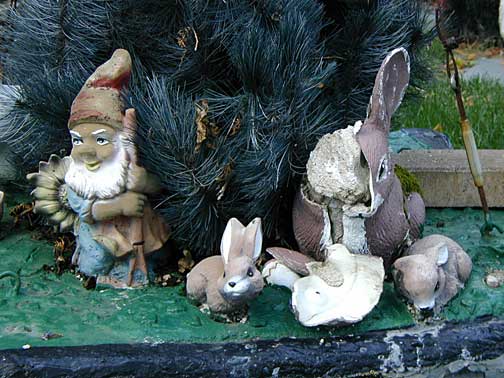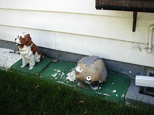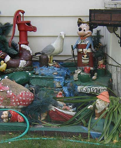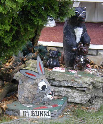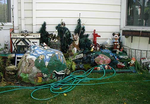 This elaborate yard show is a place I stumbled across late at night accidentally, then could not find again. The house is located on a quiet Nordeast residential street of ordinary frame houses all in a row. The house, too, is not so out of the ordinary, so that at first glance you may not notice all the playful little characters gathered around the house. Look closely and you'll find a homemade Disney-like land of happy animals frolicking, smiling and cracking little jokes.