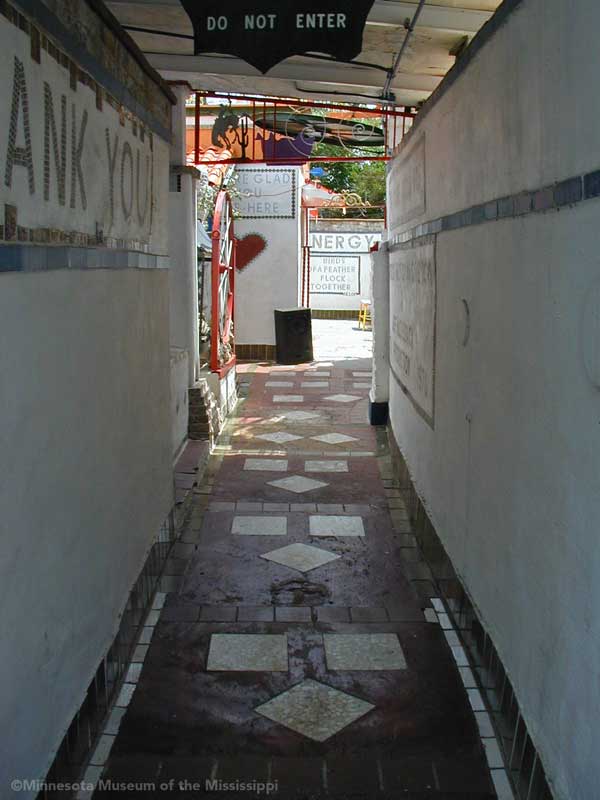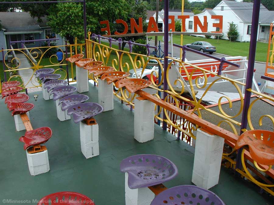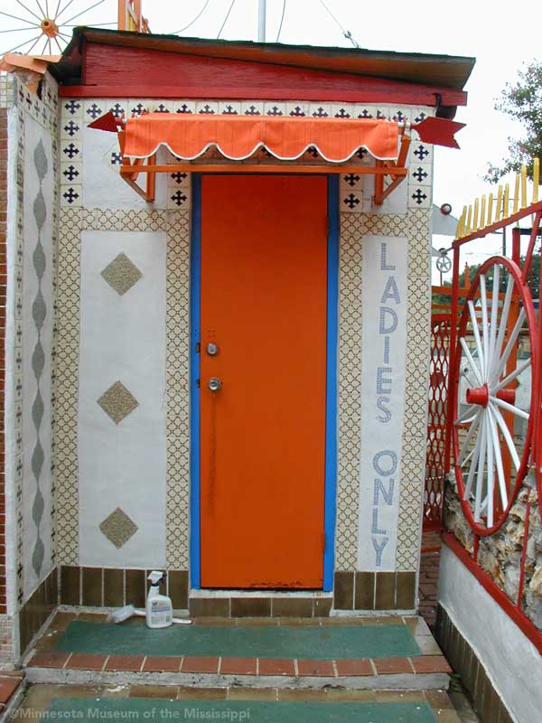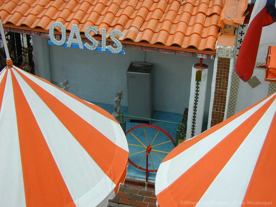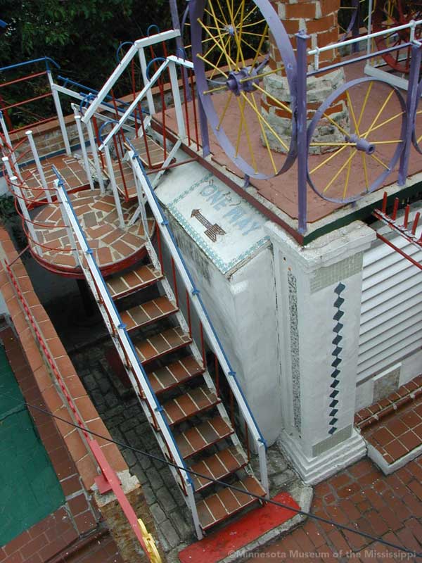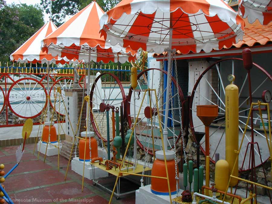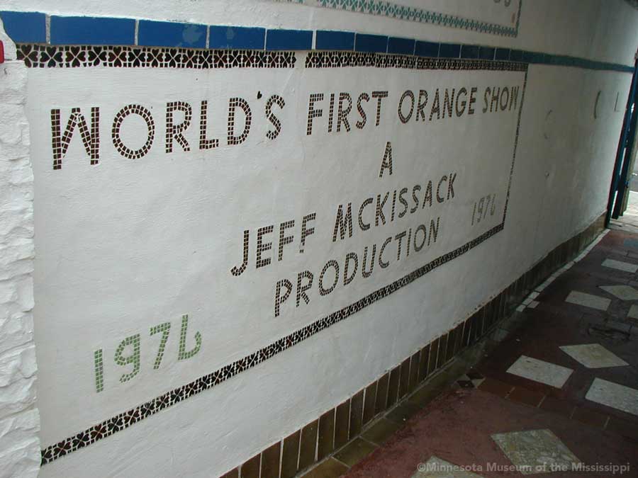 The Orange Show was built by Jeff McKissack as a shrine to his favorite fruit, the orange. While working as a letter carrier he was inspired to bring home materials scavenged along his route and began building in 1956. On the two lots next to his house he worked for 25 years to build displays about oranges, a small theater, stairways, tiled walls and balconies in a sort of labyrinth in bright colors. He opened the site to the public in 1979, but less than a year later died from complications of a stroke.