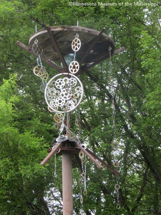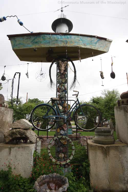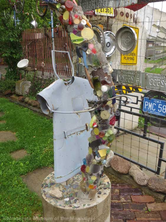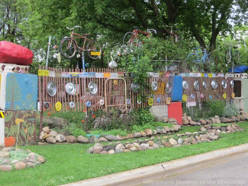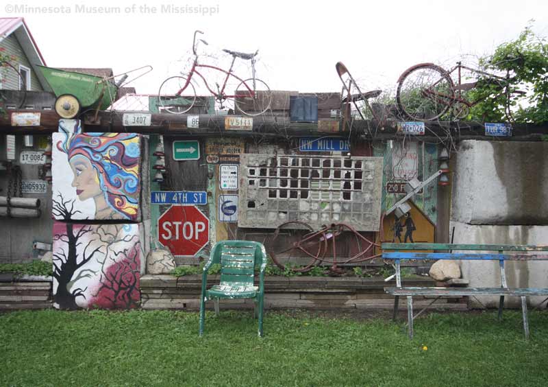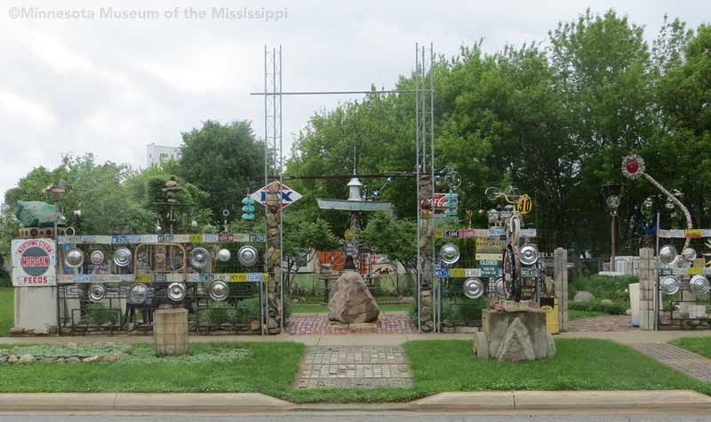 Max Weaver has collected things since he was young. In the 1970s and 80s, when numerous historic buildings in Mason City were demolished, he saved bricks and stones from the lost buildings. In 2003 he began building a quiet rock garden for his wife on an empty lot he owned next to a train track. In the years since then he has added to the grounds to create a public space open to neighbors during daylight hours.