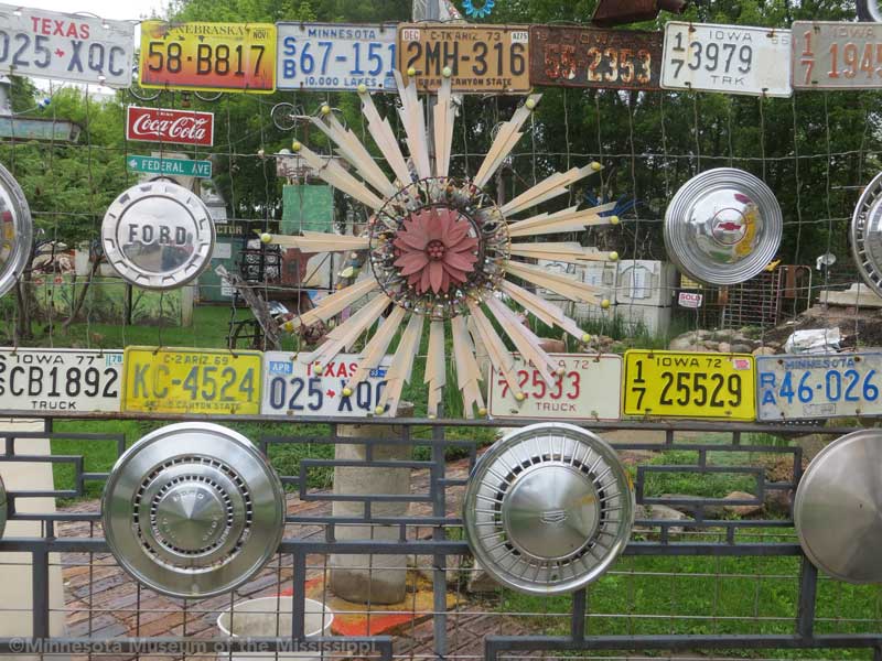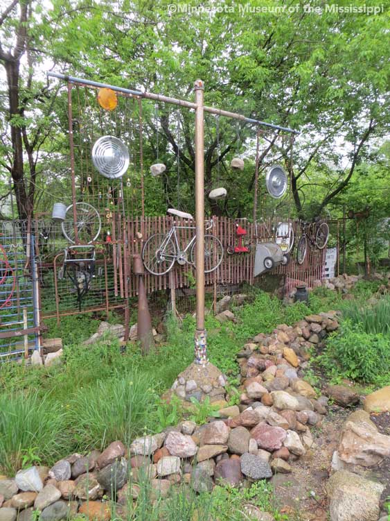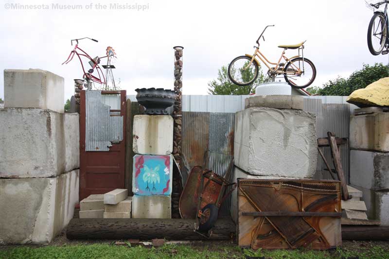 Though the sign in front labels it the Rancho Deluxe Z Garden, other times Weaver refers to it as The Original Bicycle Garden. Bicycles are a recurring motif, welded on poles, perched on the tops of the walls and fences, or disassembled gears hanging from posts. Fittingly, the garden was a camp site for cyclists on the 2014 RAGBRAI ride across Iowa. Other common recycled components of the garden include hubcaps, license plates and retired signs from local businesses. The garden is divided by stacks of large concrete cubes into a number of rectangular areas like open-air rooms. One room features a raised stage for performances.