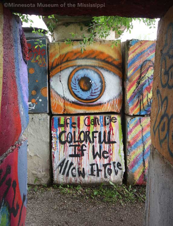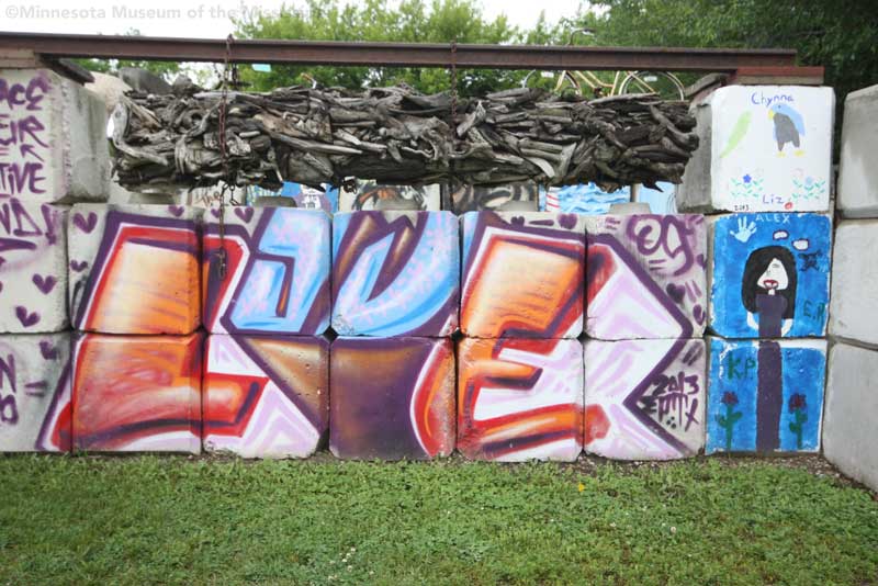The artist, Max Weaver, has also served as a city councilman for three terms and once ran for mayor. When not in office he's remained involved in politics as a citizen observer and gadfly advocating for Mason City. The garden is meant as a community space for local creative people to hang out. Artists are invited to contribute paintings to the cement walls. One are of the garden is dedicated as a veterans memorial, with a sculpture made of helicopter doors from the Vietnam War contributed by Mason City vet Dennis Withers. Another wall features an elaborate castle-like fake door by local artist Mark Whitten.