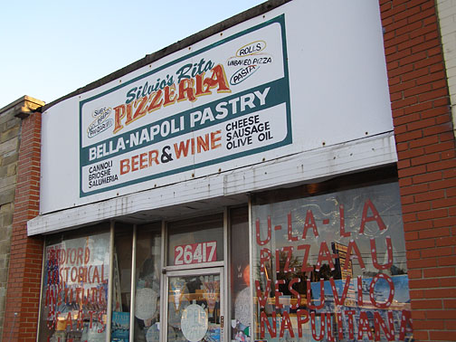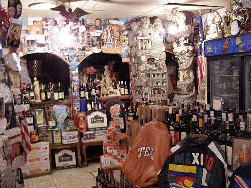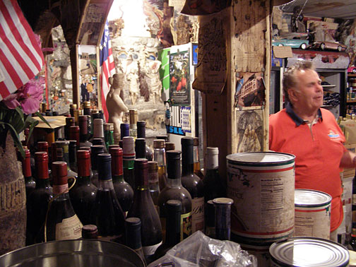 And Silvio has filled the interior of the restaurant with his artwork as well. Every flat surface of the walls has been papered over with a dense collage of imagery of famous figures and Silvio's writing in Italian and English telling us why these people are important. The city health department did not appreciate this bric-a-brac cluttering every surface of the restaurant, and after several battles, Silvio was forced to quit selling pizza in 2002. He stills sells groceries, and the dusty bottles of wine which crowd all available shelf space and floors of the aisles. You won't be allowed to leave without a bottle!