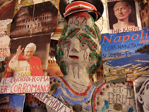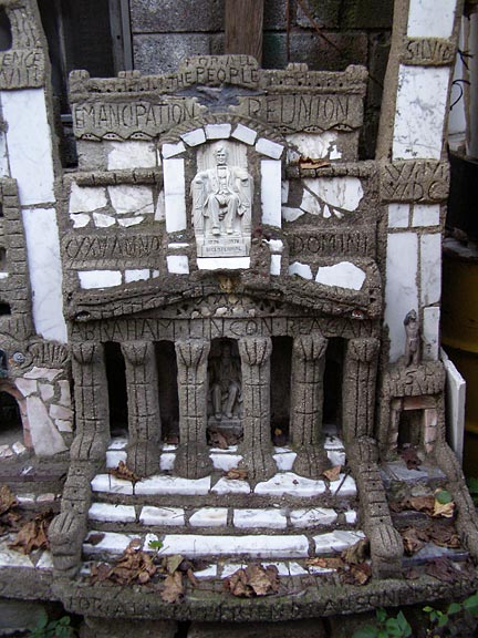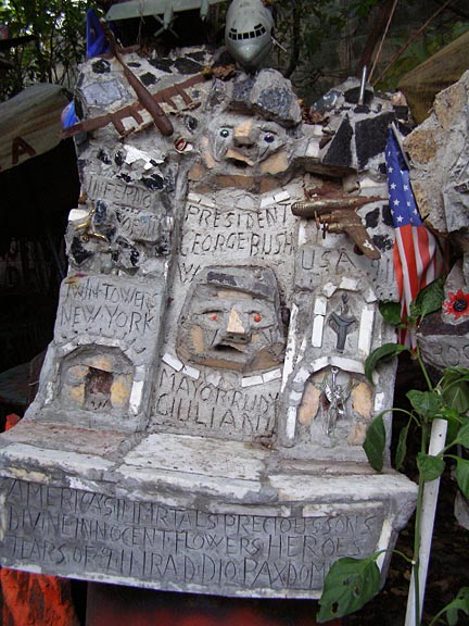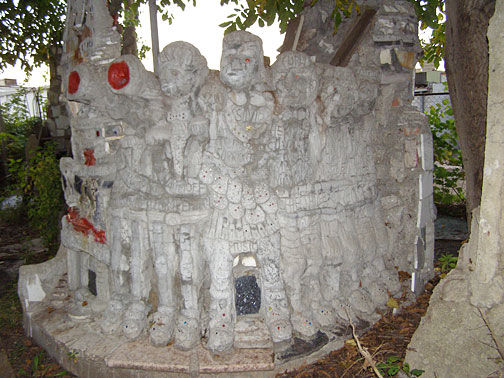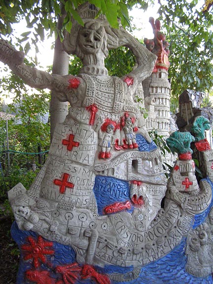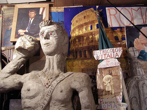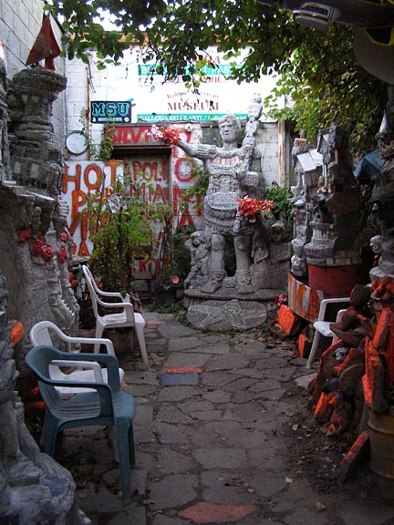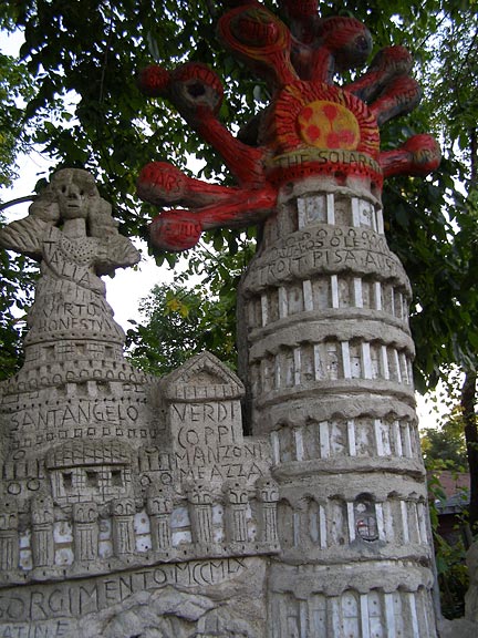 Silvio Barile crowded the garden in back of the pizza parlor with brightly-painted monuments and then filled an empty lot across the alley with more. A walk through the garden is an education, as Silvio explains the significance of each monument, extolls the great works of Italian art, breaks into operatic songs, or argues his political beliefs.