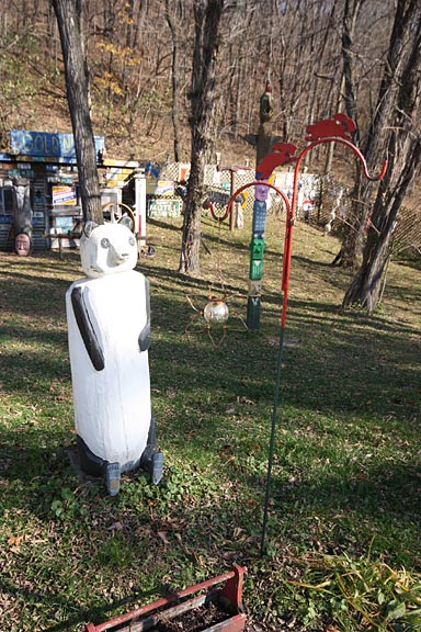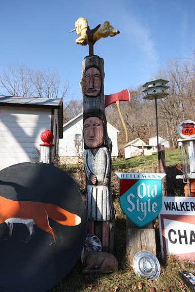 On a winding road just west of the Mississippi River town of McGregor, Dan Slaughter has assembled a cluttered yard of chainsaw carvings and antique signs. For many years he worked in auto repair, when one day, while fixing a customer's chainsaw, he was suddenly inspired to start making artwork.