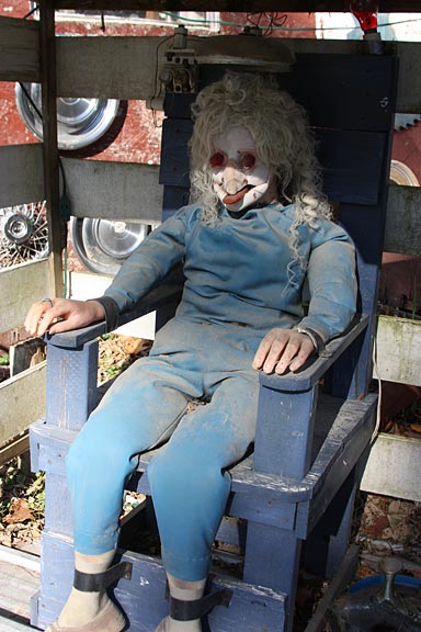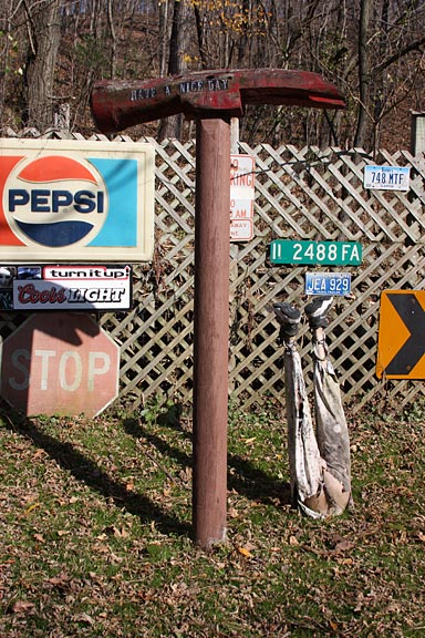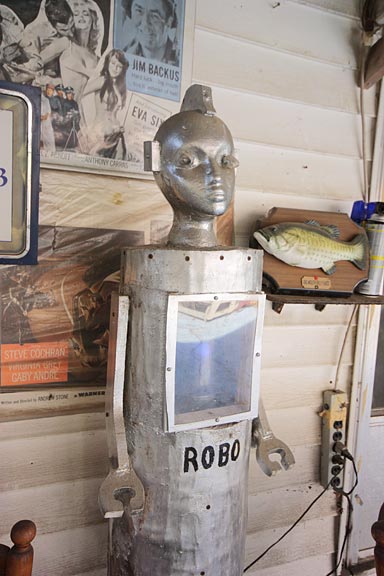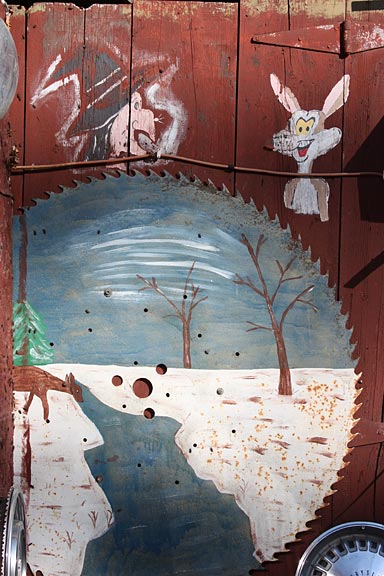 His chainsaw sculptures are not the usual eagles and bears but depict movie or cartoon pop culture characters and one-liner jokes. They are carved from telephone poles and recycled wood and painted bright colors. Slaughter displays his artwork here and there in the backyard, behind the house or in the barn, amongst vintage advertising signs and antique carnival rides he has collected.