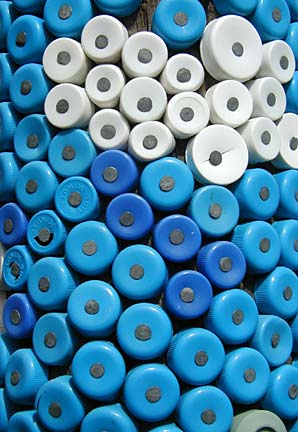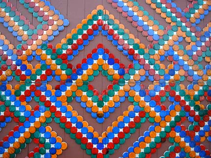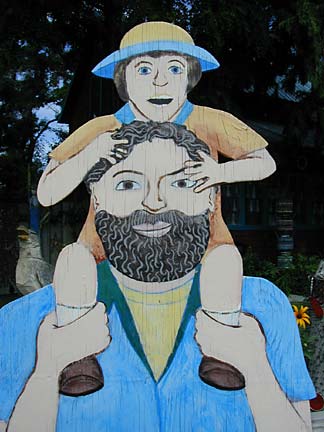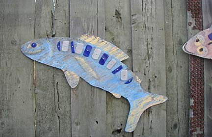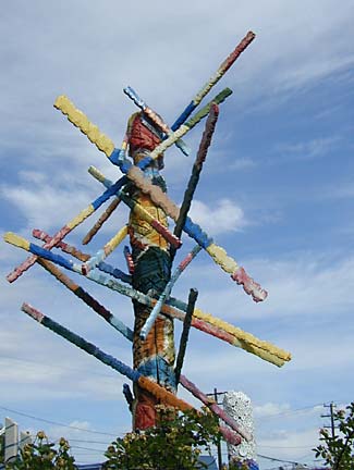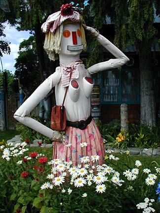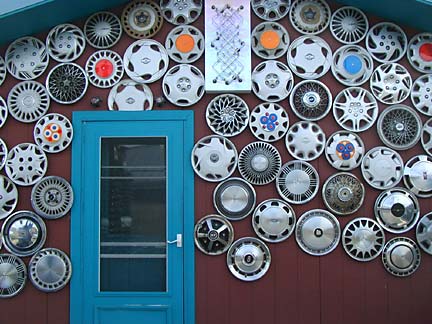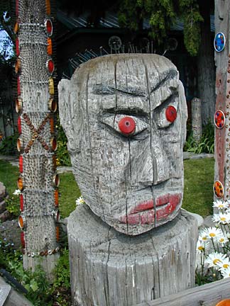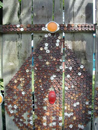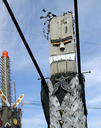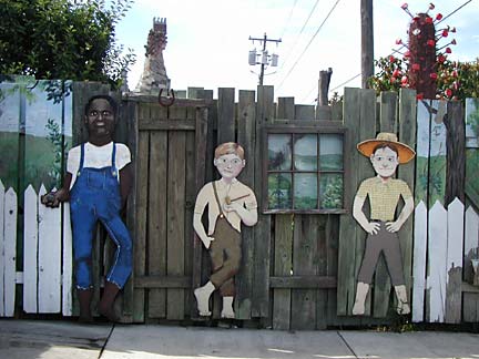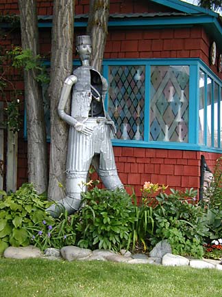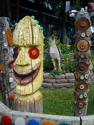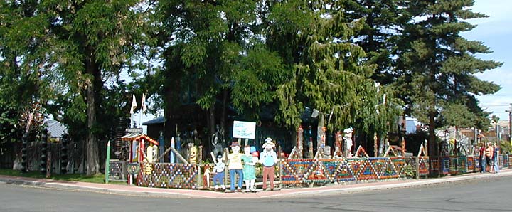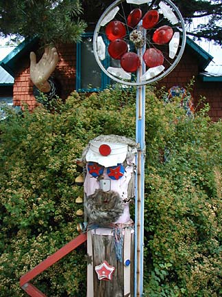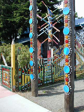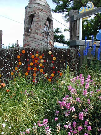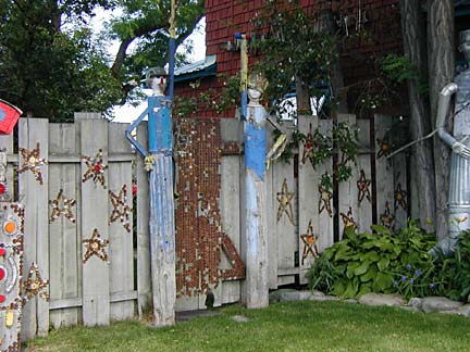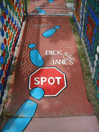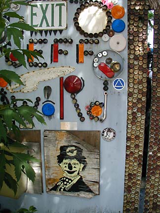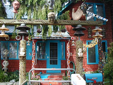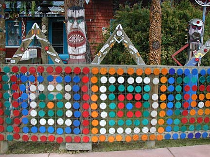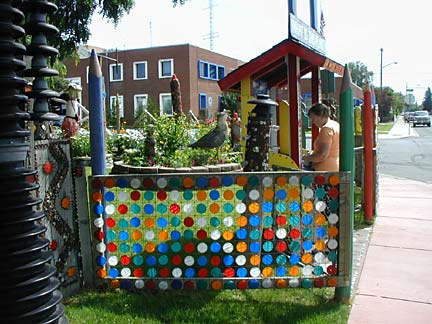 Artists Dick Elliott and Jane Orleman (and their dog Spot) bought a boarded-up house with a barren yard in 1978 and rehabilitated the neglected property into a cheerful home surrounded by flowers and recycled sculptures and paintings. Dick's art features bottle caps and reflectors in dramatic geometric patterns, while Jane's paintings portray autobiographical and mythological themes, and their house and yard combine both the abstract and personal in a playful and colorful manner.
