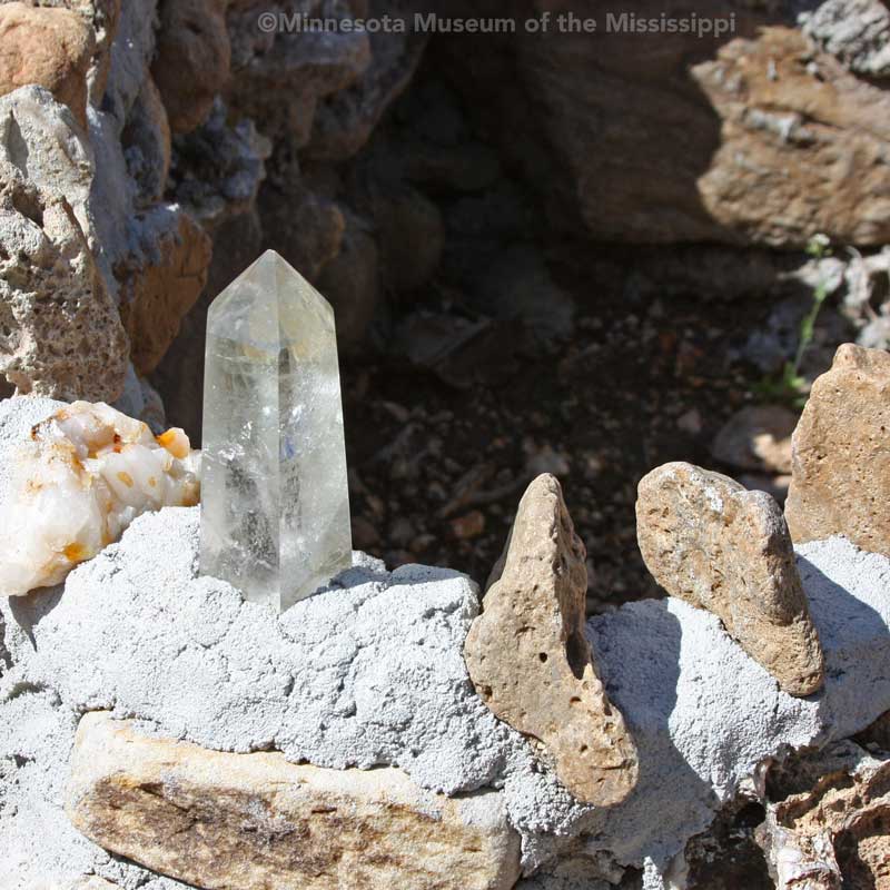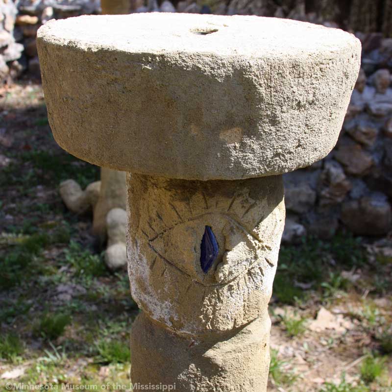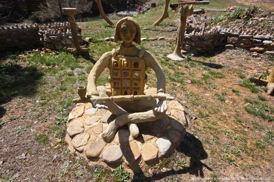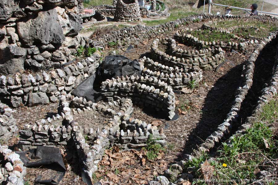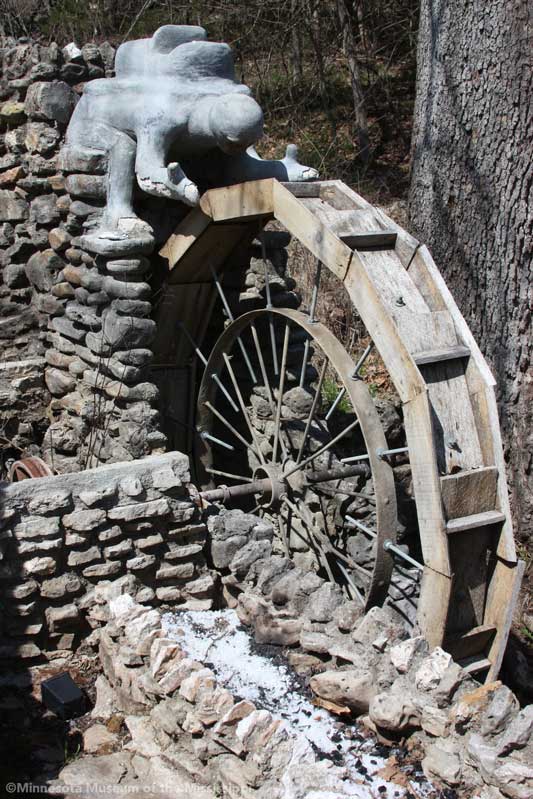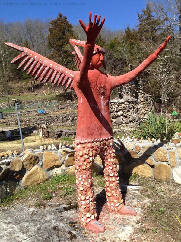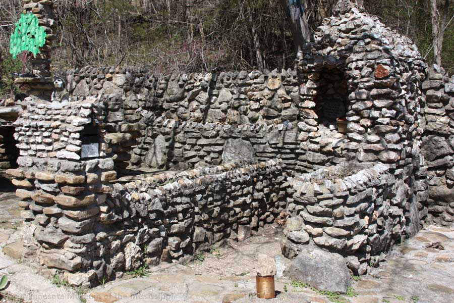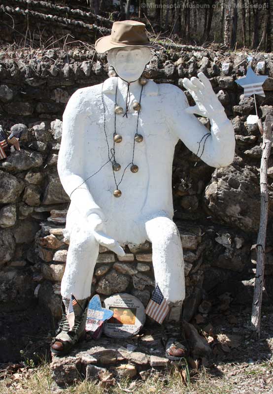 Baggett worked on his rock memorial for more than two decades. He hired local children to gather river cobbles and had some help from his grown children, but did much of the construction himself. He described to visitors how he sometimes received inspiration from an old Native American man, or from mysterious knocks on his door in the middle of the night which guided him in what to add to the memorial next. Atop a hill overlooking the garden he built a stone house and round meditation building with an oversized hot tub large enough for dozens of bathers. Wearing his habitual overalls, he guided visitors around the property, explaining the astrological meaning of his rock creations and religious symbolism of the sculptures. He added several white painted concrete figures, Jesus pouring water from a pitcher and a white buffalo charging up the hill with a Native American pulling his tail. At the entrance he added a life-size concrete self portrait sitting on the wall waving at passersby.