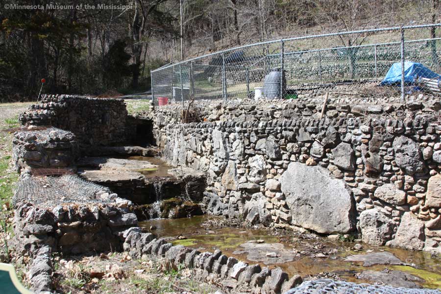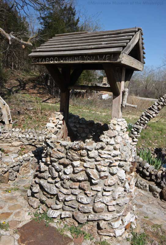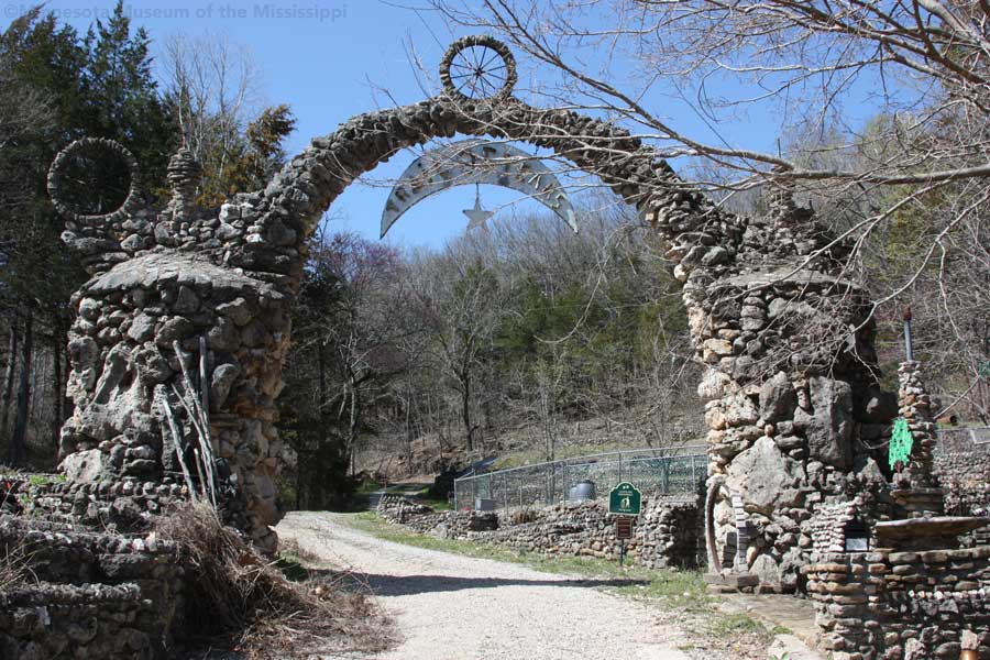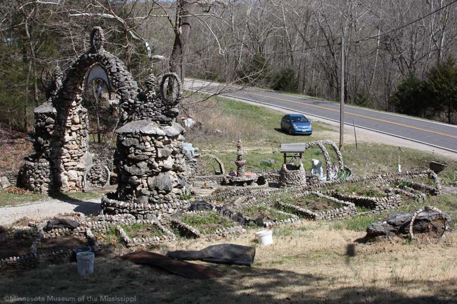 Baggett built stone walls along the driveway leading into the property. An arch topped by an iron wagon wheel is a dramatic entry point. Going up the hillside he built terraced stone walls for garden beds topped with upright stones like teeth. Perhaps he was inspired in his stone construction by Stony Dell Resort, a tourist attraction built in 1932 by stonemason George Prewett just a third of a mile east. The resort centered around a chilly spring-fed swimming pool with decorative rock walls, a waterfall and rugged stone buildings, as well as a restaurant, store and rental cabins along the road. The resort was popular, but after Route 66 was rerouted in 1946 the business closed. The swimming pool was demolished to make way for Interstate 44 in the 1960s, while some of the stone walls of the store and the ruins of the wooden cabins can still be seen on the north side of Highway D.