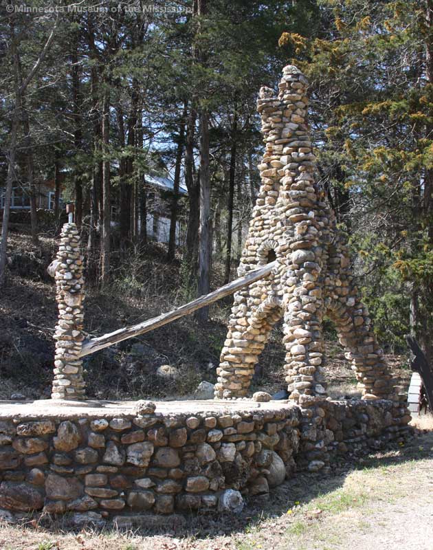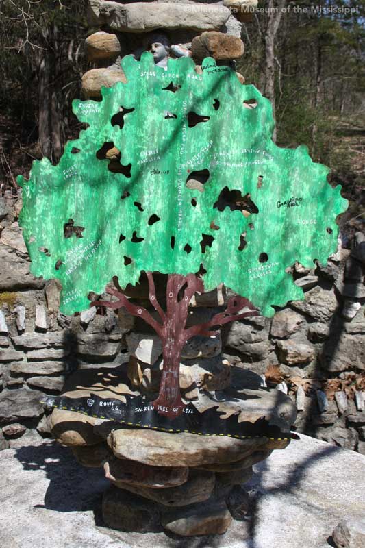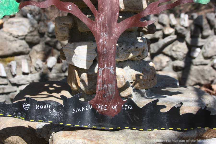 Larry Baggett was born in the small town of Hackberry, Tennessee in 1925. He worked for many years as an appliance repairman in Ohio, Tennesee and Missouri. By the 1970s he and his wife Eileen bought property along Highway D (old Route 66) just south of Jerome. They had a plan to build a commercial campground on the land, but within a few years Eileen apparently moved to Oklahoma and Larry's plans changed to building a roadside rock garden picnic spot. Someone told him his land had been along the Trail of Tears, the forced government relocation of Cherokee and other allied tribes from their homelands westward across Missouri in the harsh winter of 1838 in which many died from starvation and cold. The tragic story awakened him and he began building a memorial to commemorate that hard journey of 150 years ago.
