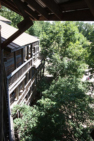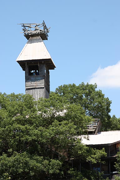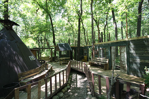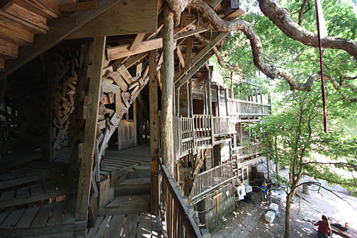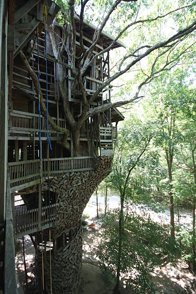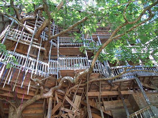 This 10-story treehouse is nearly 100 feet high and said to be the largest in the world. In 1993, Horace Burgess received a vision from God to build an enormous tree house. The vision was an image of the completed structure, for which God promised an endless supply of materials. The wood for the tree house was salvaged from derelict barns and gleaned from construction debris, enough to build a vast labyrinth of weathered wood, staircases and balconies. The uninhibited vertical ambition of the construction recalls that of Bishop's Castle in wood instead of stone and wrought iron.