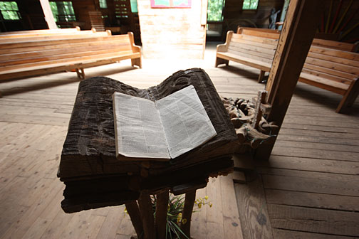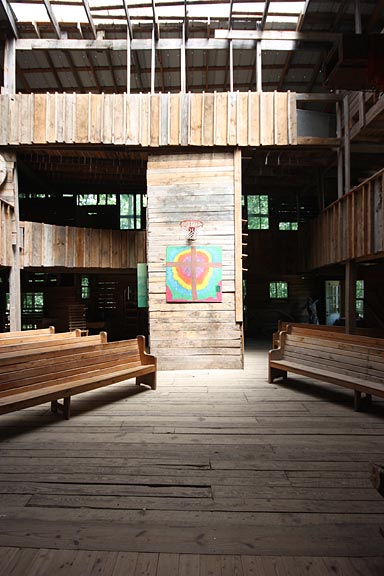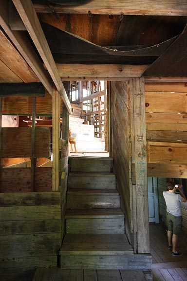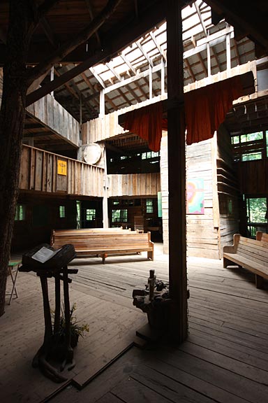 The larger part of the tree house, which Burgess calls "The Way" is built around six oak trees. Several staircases and passageways lead up to a soaring chapel on the third floor, with seating for a hundred or more worshippers on multiple lofts and tiered balconies. A rough-hewn lectern holds a bible opposite an incongruous basketball hoop. On Sunday afternoons Burgess holds impromptu worship services for visitors as the minister of the tree house.