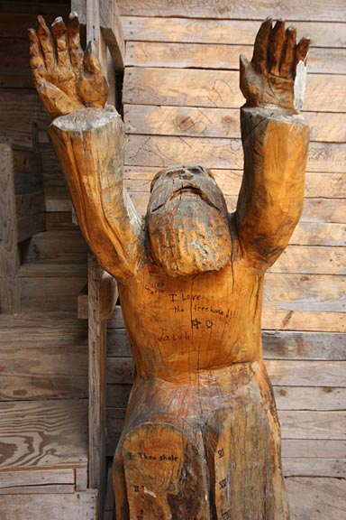In the last several years, Burgess and family members have made more effort to guard the treehouse against hooligans and troublemakers and turn the treehouse back into a testament of faith. Hundreds of visitors each day climb the wooden stairs to the top of the tower, where they will look out and just as Horace Burgess intended, see Jesus in the garden.