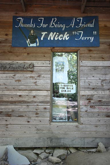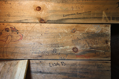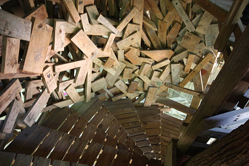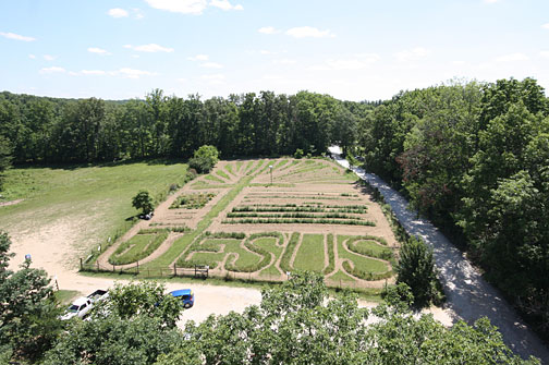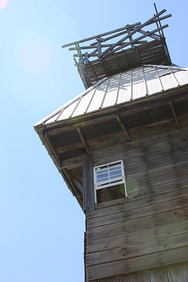 Connected to the sanctuary on the side is a taller section of the tree house built around a large white oak tree. From the ground, a spiral staircase walled with construction scraps climbs higher and higher, seven and eight stories of stairs getting steeper with each flight and leading to a tower which emerges from the tree top with a view out over the surrounding forest and down below a field with an image of the cross and the letters "JESUS" spelled out in flowers. The tower sways gently with the footsteps of the many visitors plodding ever upwards, ringing chimes made from welding bottles up above in the belfry.