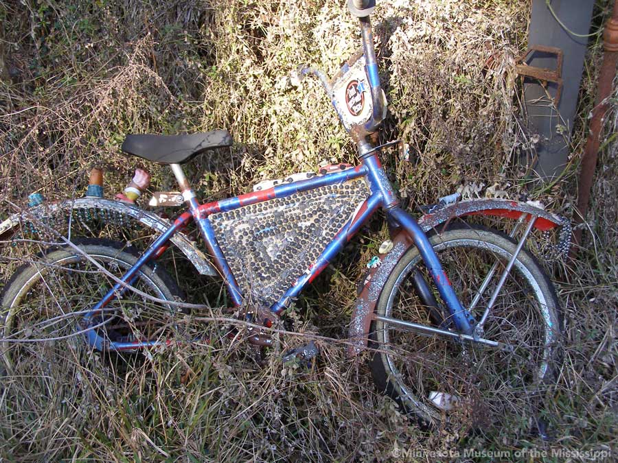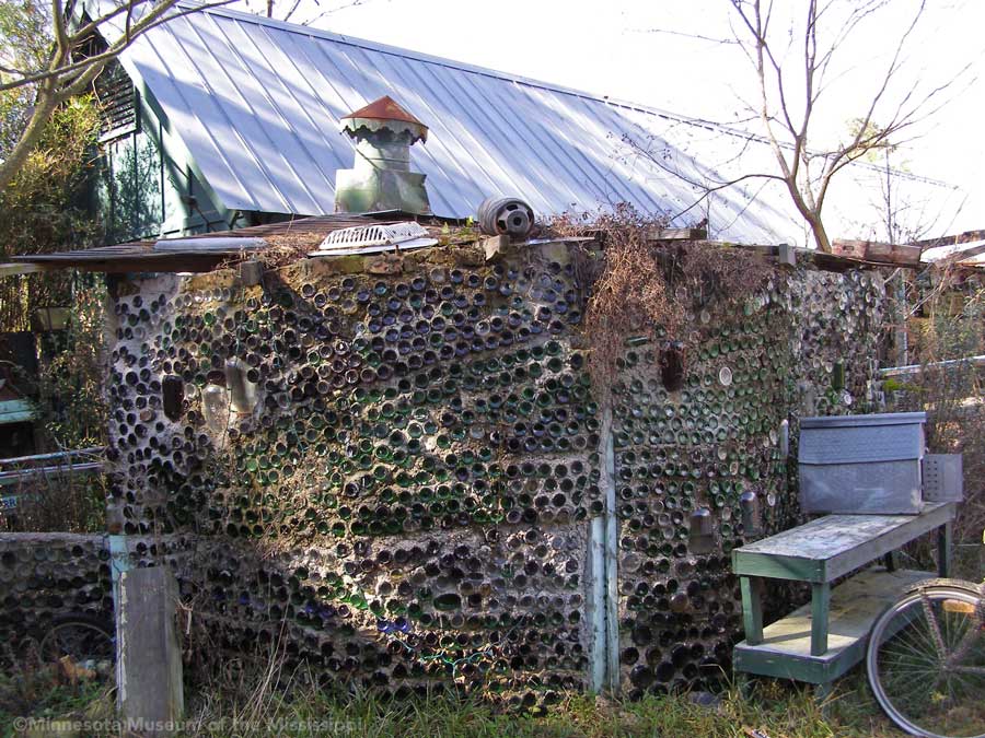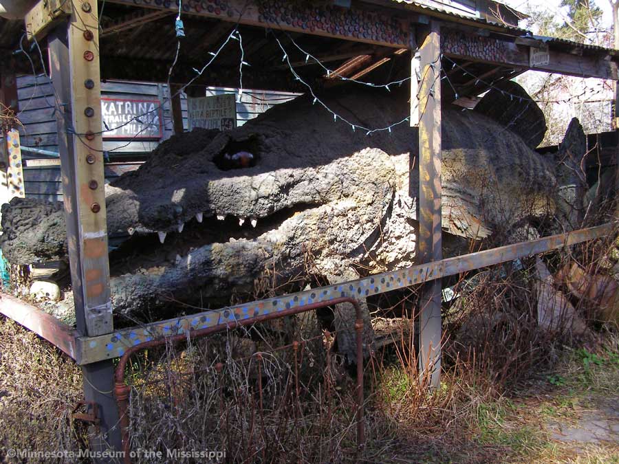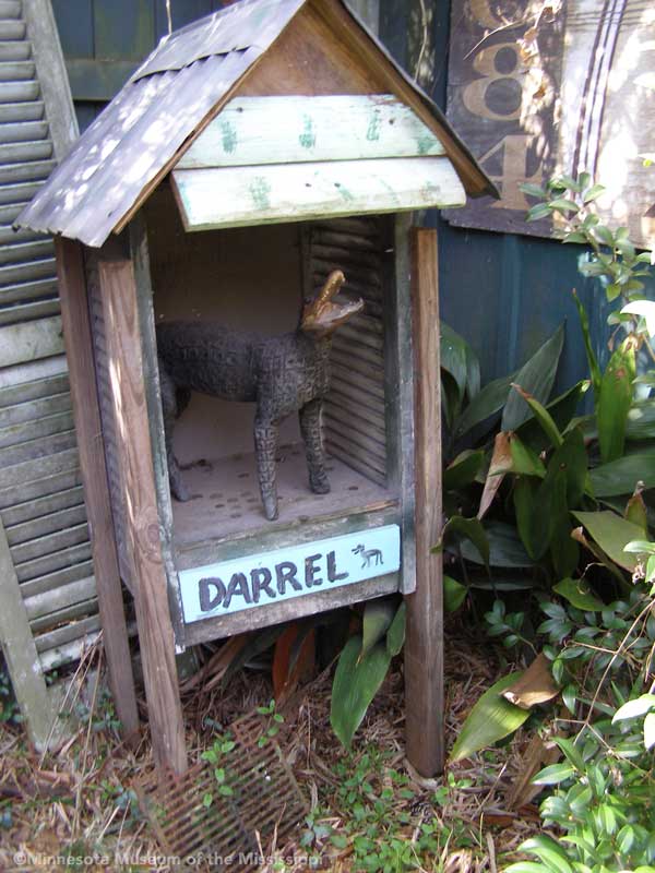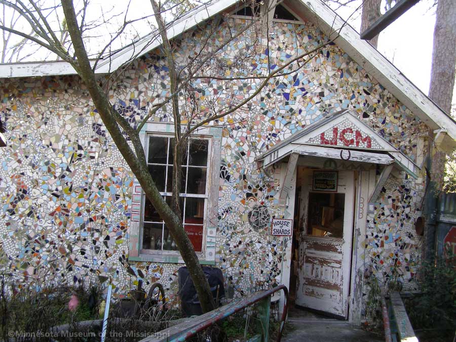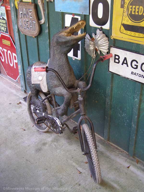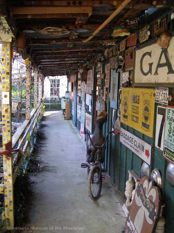 Passing through the gift shop, the visitor pays entry to a mysterious door, which leads out to an open-air courtyard enclosed by small buildings. A long building to the side houses a large collection of paint-by-number pictures and mechanical dioramas which come to life for a quarter. Some of the more whimsical exhibits include a tiny "ten-foot alligator" peep show, and other Louisiana equivalents to the classic jackalope. The largest of these is a car-sized Bassigator, a former Mardi Gras parade float art car, now housed under a canopy in a small yard surrounded by decorated bicycles slowly melting away into the rampant vegetation. At the far end of the museum grounds lies the House of Shards, a small structure covered in a glittering picassiette of broken glass and mirrors.