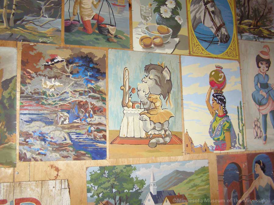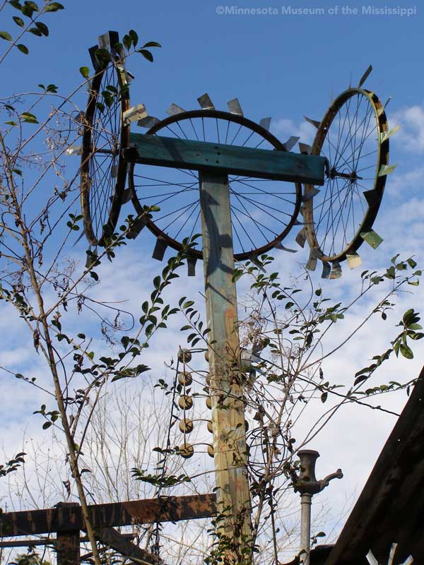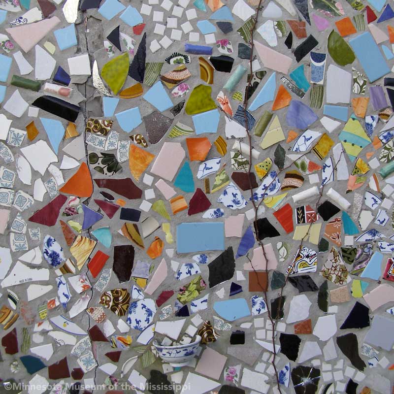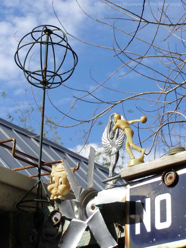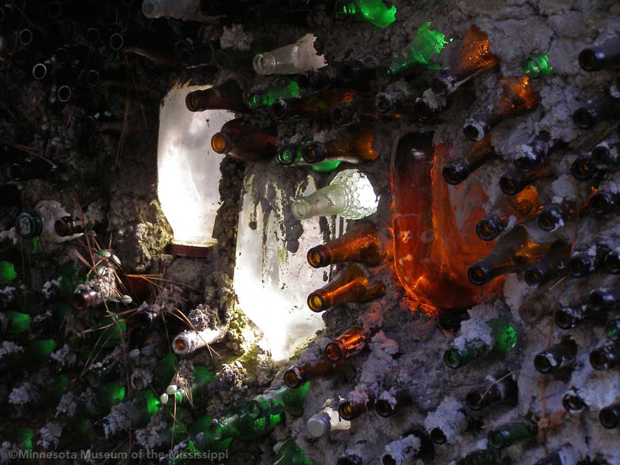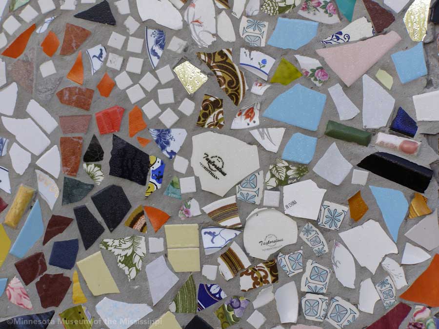 Passing through the gift shop, the visitor pays entry to a mysterious door, which leads out to an open-air courtyard enclosed by small buildings. A long building to the side houses a large collection of paint-by-number pictures and mechanical dioramas which come to life for a quarter. Some of the more whimsical exhibits include a tiny "ten-foot alligator" peep show, and other Louisiana equivalents to the classic jackalope. The largest of these is a car-sized Bassigator, a former Mardi Gras parade float art car, now housed under a canopy in a small yard surrounded by decorated bicycles slowly melting away into the rampant vegetation. At the far end of the museum grounds lies the House of Shards, a small structure covered in a glittering picassiette of broken glass and mirrors.