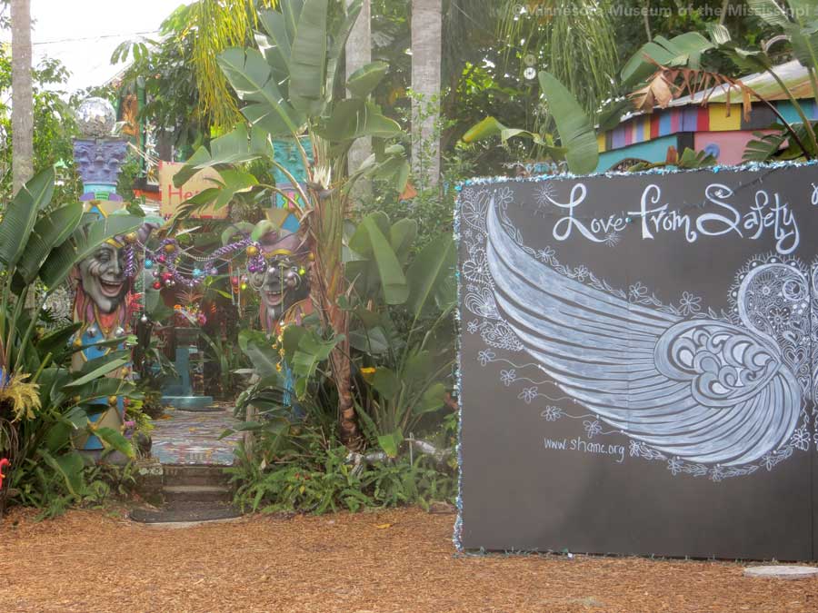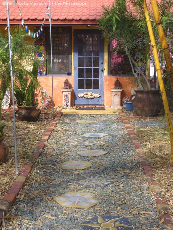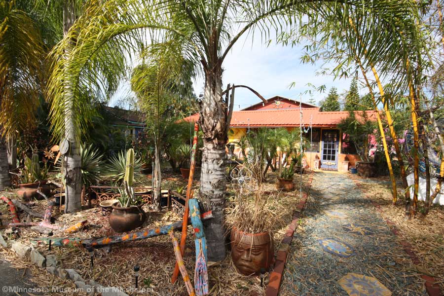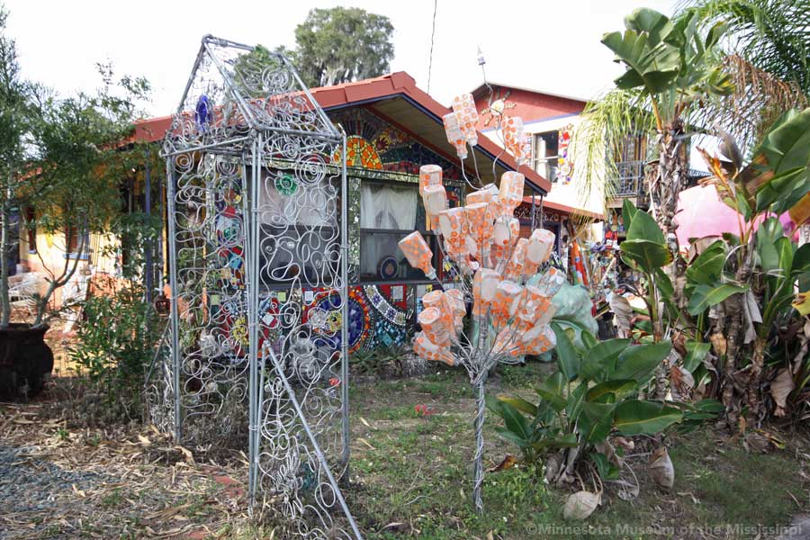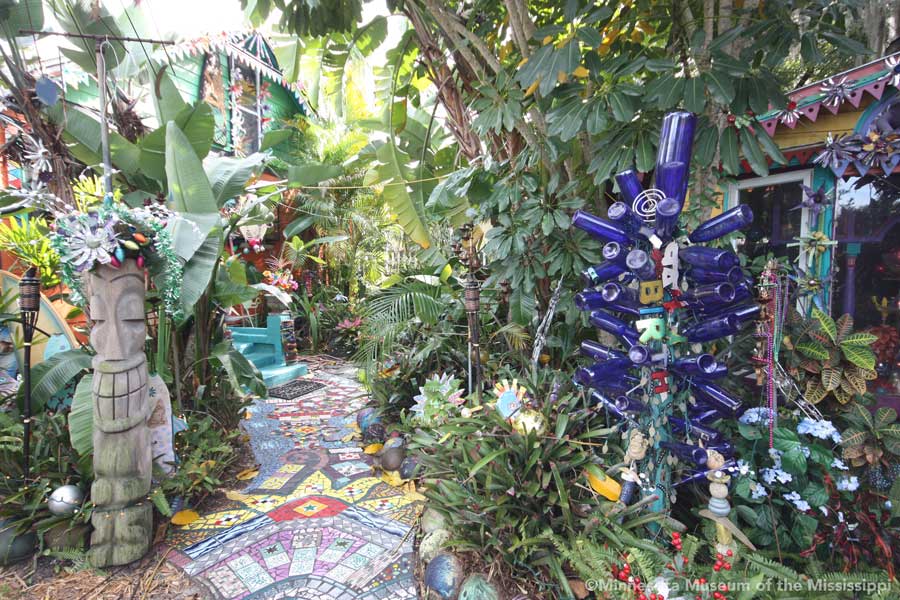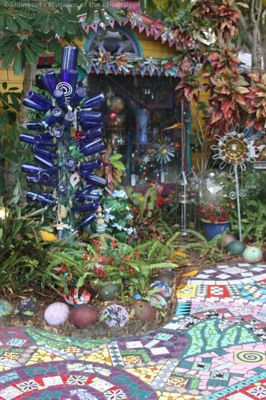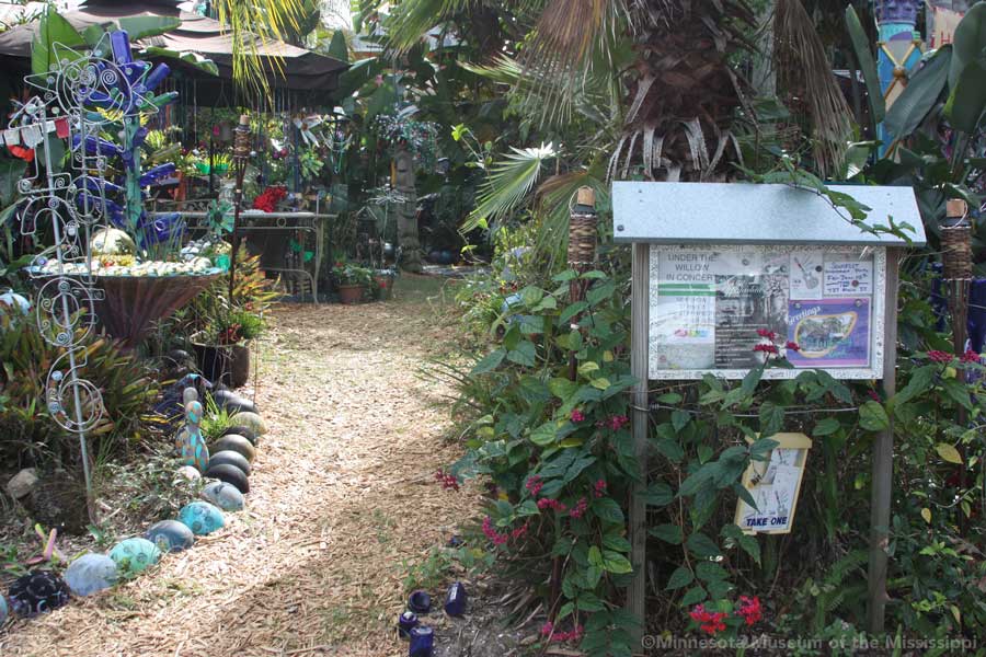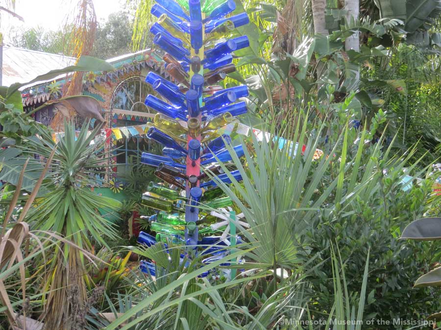 The garden itself is open during daylight hours, though visitors are reminded that it is the artists' home. Mosaic pathways lead the way between palms and dense Florida greenery. Sculptures made by folk artists, tiki carvings and other surprises peek out from the flowers. Bottle trees reminiscent of other art environments gleam in the sun. A gazebo salvaged from a historic restaurant at the center of the garden is used as an open-air craft workshop. Oversized flowers made from recycled plastic drink bottles are a remnant of a Christmas display theme of recycling. The exuberant bright colors and clutter fit right in with the tropical density of the garden.