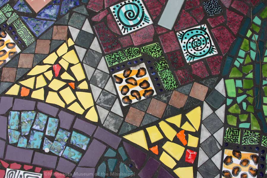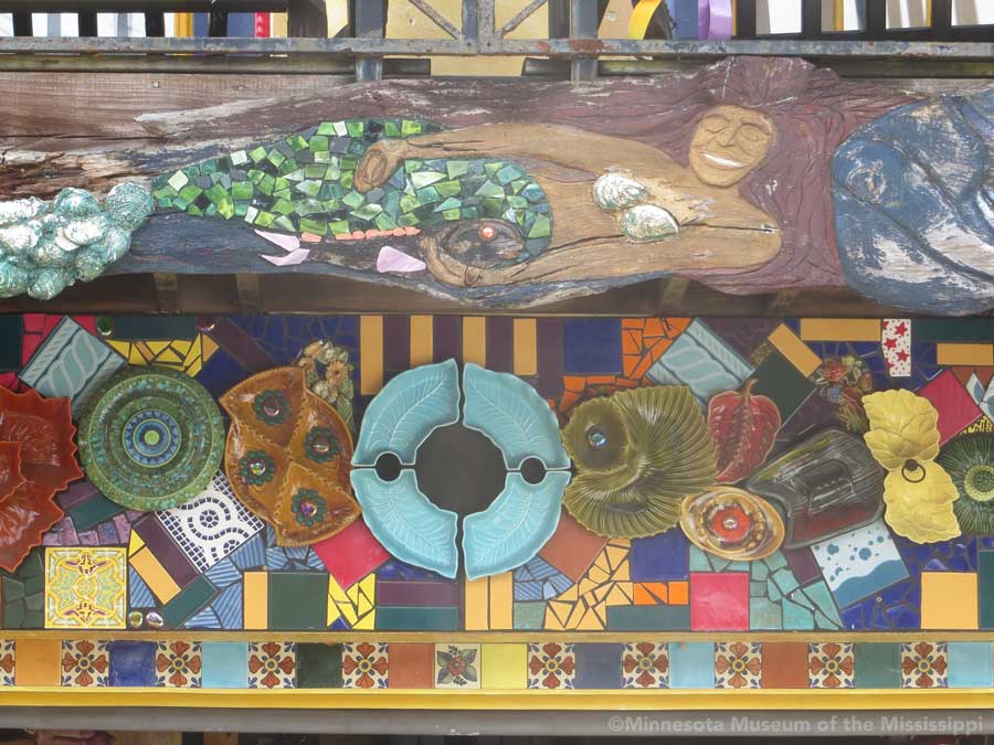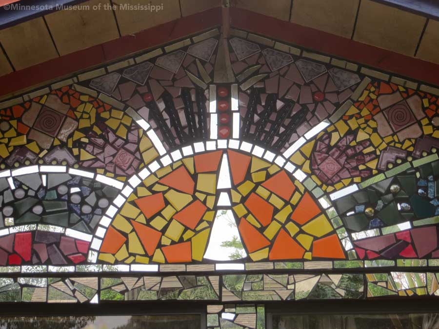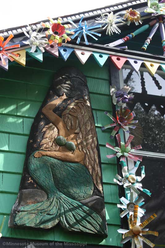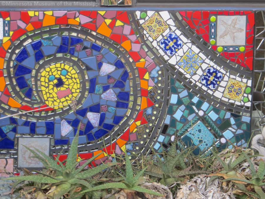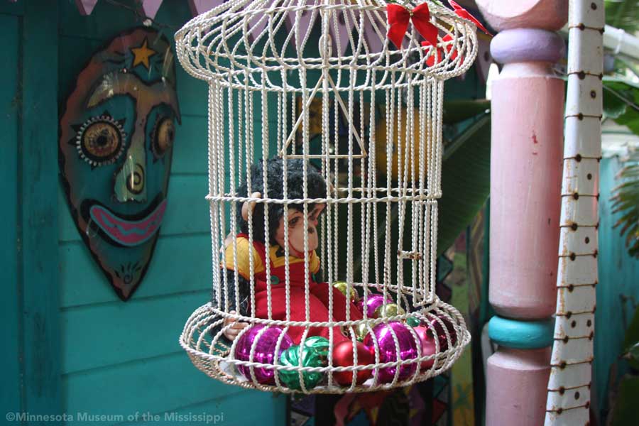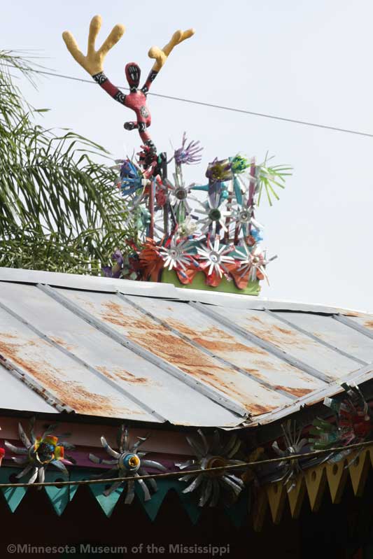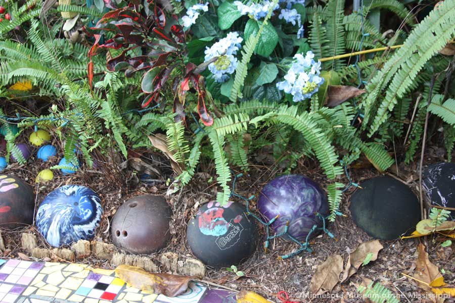 The garden itself is open during daylight hours, though visitors are reminded that it is the artists' home. Mosaic pathways lead the way between palms and dense Florida greenery. Sculptures made by folk artists, tiki carvings and other surprises peek out from the flowers. Bottle trees reminiscent of other art environments gleam in the sun. A gazebo salvaged from a historic restaurant at the center of the garden is used as an open-air craft workshop. Oversized flowers made from recycled plastic drink bottles are a remnant of a Christmas display theme of recycling. The exuberant bright colors and clutter fit right in with the tropical density of the garden.