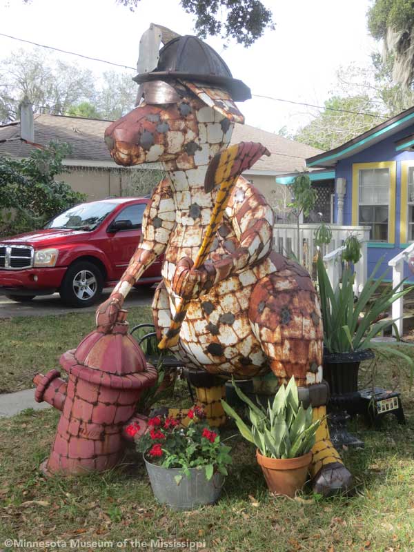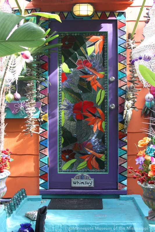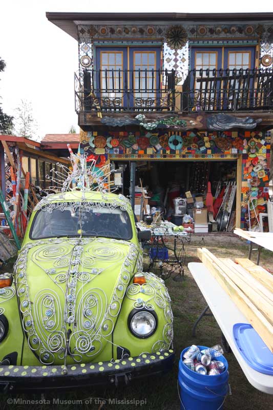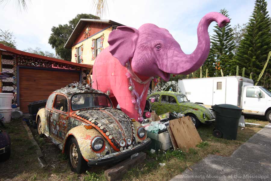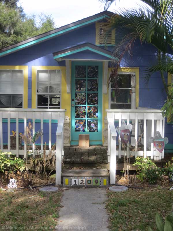 Whimzeyland is a home base for Todd and Kiaralinda who travel extensively to art fairs around the country selling sculptures made of bent aluminum wire. They've created a number of art cars decorated with mosaics, recycled computer parts, or wire filigrees. The couple, who sometimes call themselves the "Whimzey Twins", have been busy promoters of the arts in Safety Harbor, starting an annual singer-songwriter music festival, and leading the creation of the nearby Safety Harbor Arts and Music Center as a home for creative people of all types. Across the street from Whimzeyland they turned another small house into Casa Loco, a rental home for visitors.