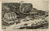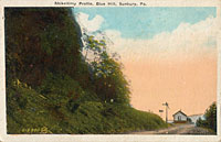 Profile Rock Outcrop from cliff hanging over Pennsylvania Route 42 a little north of Catawissa along the Susquehana River. Two postcards show the formation from different sides, along with changes in the roadway from the early 1900s-1930s. MNM#01-01299 |