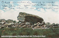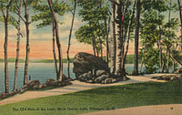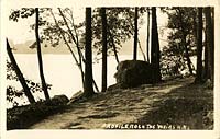 Profile Rock A boulder located somewhere near The Weirs, a narrows at the mouth of Paugus Bay on the west side of Lake Winnepesaukee. Presumably not the same boulder seen in the previous postcard. MNM#01-01146 |