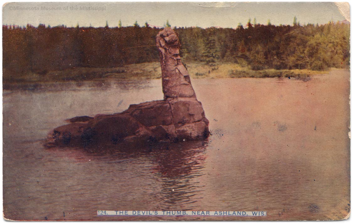Pillar of rock extending from rocky islet at unknown location, possibly in Lake Superior near Apostle Islands