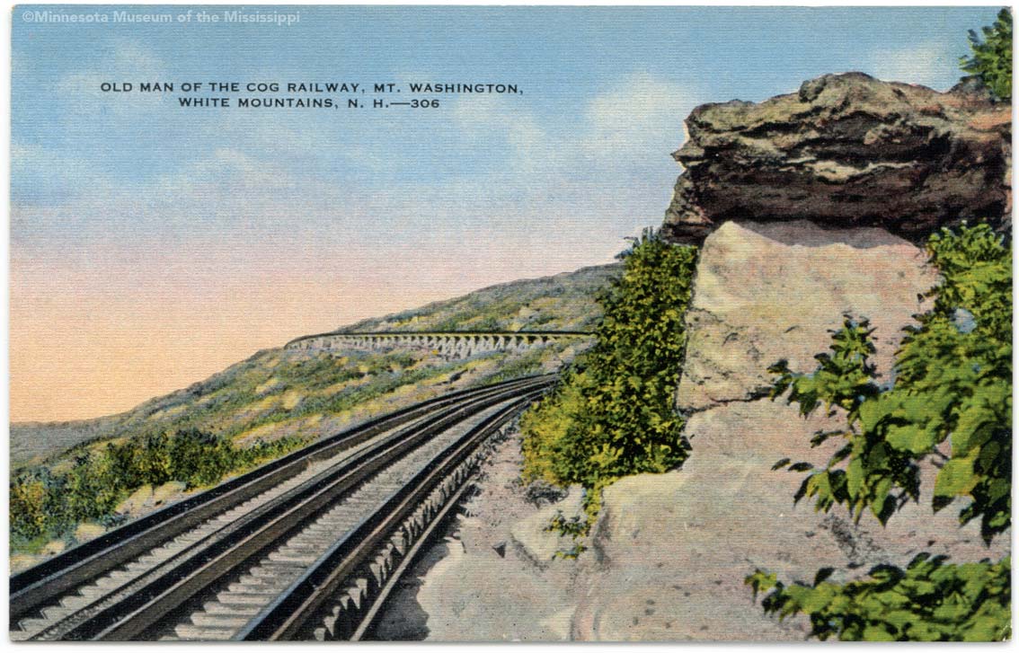 Obverse: Old Man of the Cog Railway, Mt. Washington, White Mountains, N.H. - 3-6 Reverse: Here, on the Mount Washington Railway, is another Profile –– The Old Man of the Cog Railway. There are many profiles in the White Mountains of New Hampshire, but this facial freak is at the very peak of New England Publisher: Atlantic Post Card Co. Portland, ME. MNM#01-01236 |