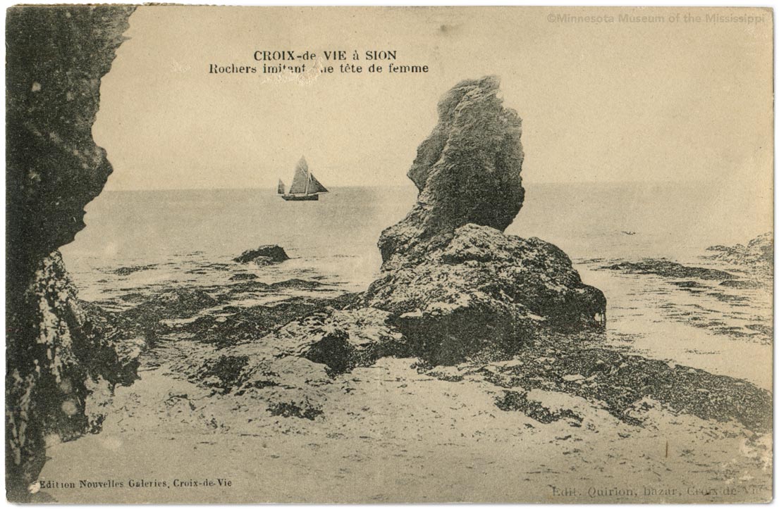 Possibly this formation of a woman's head is one of a group of face-like outcrops along the shore known by a Celtic term as "Les Cinq Pineaux" or "The Five Heads".
