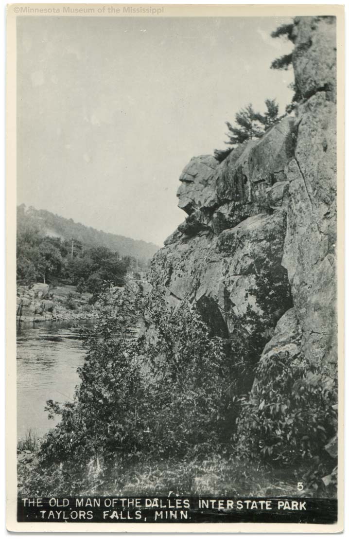 Obverse: The Old Man of the Dalles Interstate Park Publisher: unknown MNM#01-01058 Across river from Taylors Falls State Park (MN). The face is located just downstream of the highway bridge and best visible from the diving cliffs about 1000 ft south of the bridge. Other views of this formation: |
