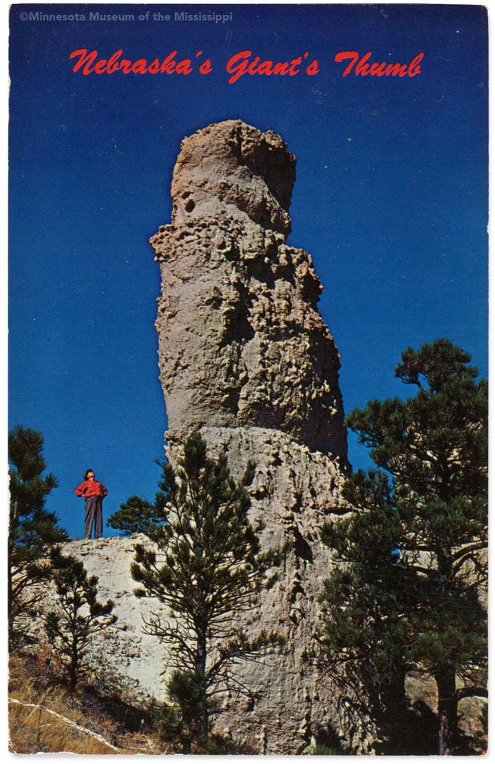 Obverse: Nebraska's Giant's Thumb Reverse: Giant's Thumb, a unique chalk rock formation, is just to the south of "Lover's Leap" which may be seen to the northwest from U.S. Highway 20 between Crawford and Fort Robinson State Park in northwestern Nebraska. Publisher: Pospeshil Card Service, Orchard, Nebraska MNM#01-02014 Chimney rock located just south of Lover's Leap Butte. Some old guidebooks refer to it as "Grant's Thumb". |