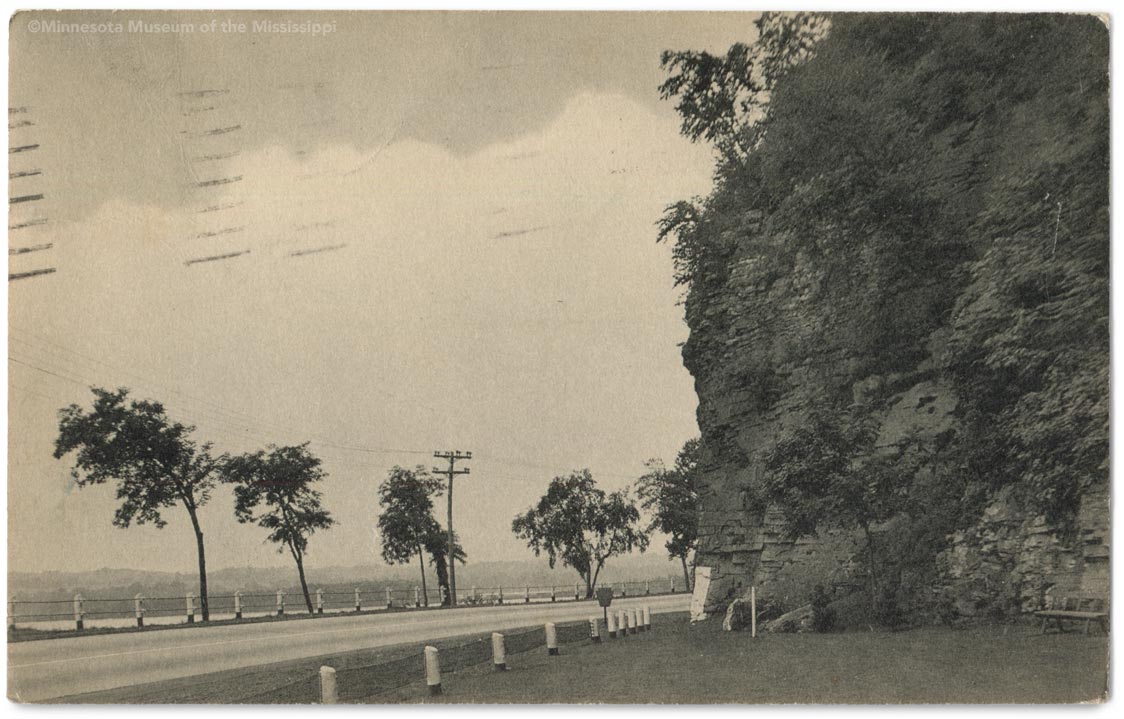Reverse: GIRTY'S FACE, on the Susquehanna trail between Harrisburg and Williamsport, Pa. Back of these rocks in the mountains was the cave of Samuel Girty the Outlaw. He was born in 1744. In 1756 his mother was killed by the Indians and he was adopted by the tribe and became one of the most desperate characters in Colonial History. Publisher: Whitman's Phototypes, Canton, Pa. MNM#01-01331 Simon Girty (1741-1818) was the son of an Irish immigrant trader who settled in Pennsylvania. After his family was captured by Lenape Indians in the French and Indian war, his stepfather was tortured and killed and young Simon was sent to the Seneca tribe who raised him. Later he worked as a scout and intepreter during the American Revolution. After witnessing atrocities by soldiers against the Lenape, Girty and several other interpreters switched their allegiance to the British and their allied Native tribes. His defection and battlefield exploits turned him into an infamous villain for the Americans. Tales of his cruelty and scorn for the law grew as they were passed down for generations before becoming the basis of an 1846 novel which popularized him as a legendary outlaw. In some tales he hid out in a cave near where the Susquehanna River narrows in order to prey on river travellers. Gold he acquired in these raids is rumored to still be hidden in caves in the river cliffs. The Susquehanna Trail auto route was planned in 1917 and paved as a 2-lane highway by the mid 1920s from Williamsport to York to meet the Lincoln Highway. A historical marker visible in the postcard image and park bench show this spot as a rest stop along the highway. The small face of Girty is visible about halfway up the cliff: